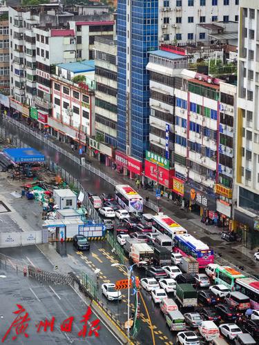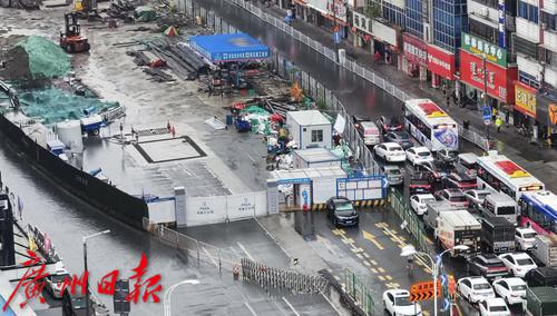 记者现场看到,洛浦路北往南大石大桥方向塞车严重,原因是由于位于大石大桥桥南富石路工地施工地段路面水浸。由于该处地势低洼,突出其来的大雨使得雨水排不及,造成该处路面双方向塞车。