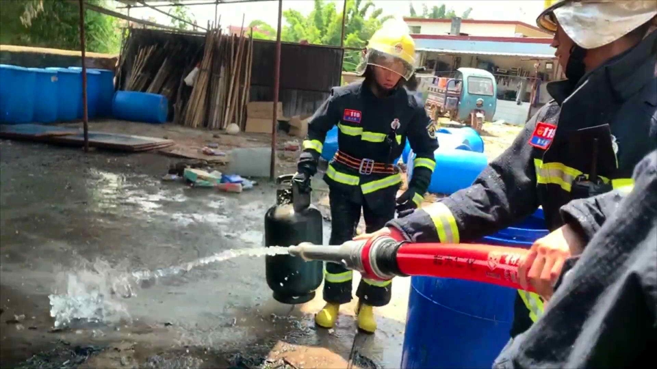 消防救援人员到达现场后经侦察发现,室外简易厨房内仍有暗火现象,并立即出动水枪进行扑灭。同时,在厨柜下发现一瓶煤气罐,为避免煤气罐遇火爆炸,消防救援人员立即将煤气罐“救”了出来,并把煤气罐放置空旷地使用水枪冷却瓶身。
