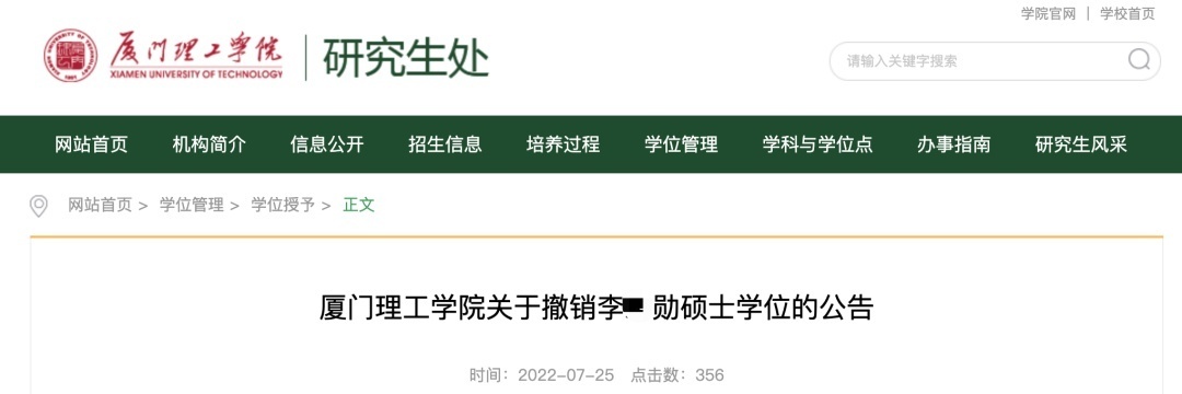 据厦门理工学院研究生处网站7月25日消息,厦门理工学院学位评定委员会25日发布《关于撤销李某勋硕士学位的公告》称,经厦门理工学院学术委员会查实,认定学校电气工程与自动化学院电气工程领域毕业生李某勋的硕士学位论文《配网故障指示器供电电源的研究与设计》抄袭他人学术成果,已经构成学术不端行为。