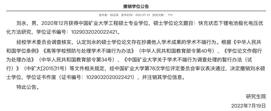 另据中国矿业大学研究生院网站7月19日公告,刘某,男,2020年12月获得中国矿业大学工程硕士专业学位,硕士学位论文题目:快充状态下锂电池极化电压优化方法研究,学位证书编号:1029032020022421。