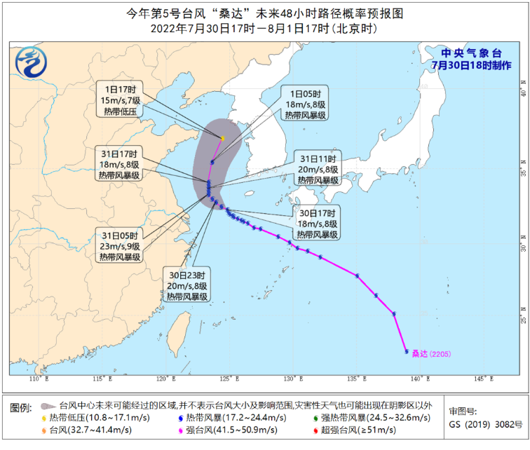 31日“桑达”将在黄海南部转向偏北方向移动