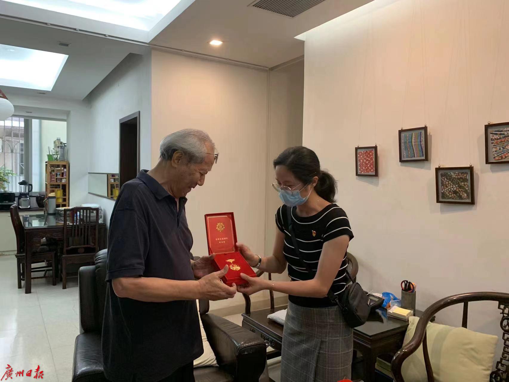张艳上门给社区50年党龄的老党员颁发“光荣在党50年”纪念章。