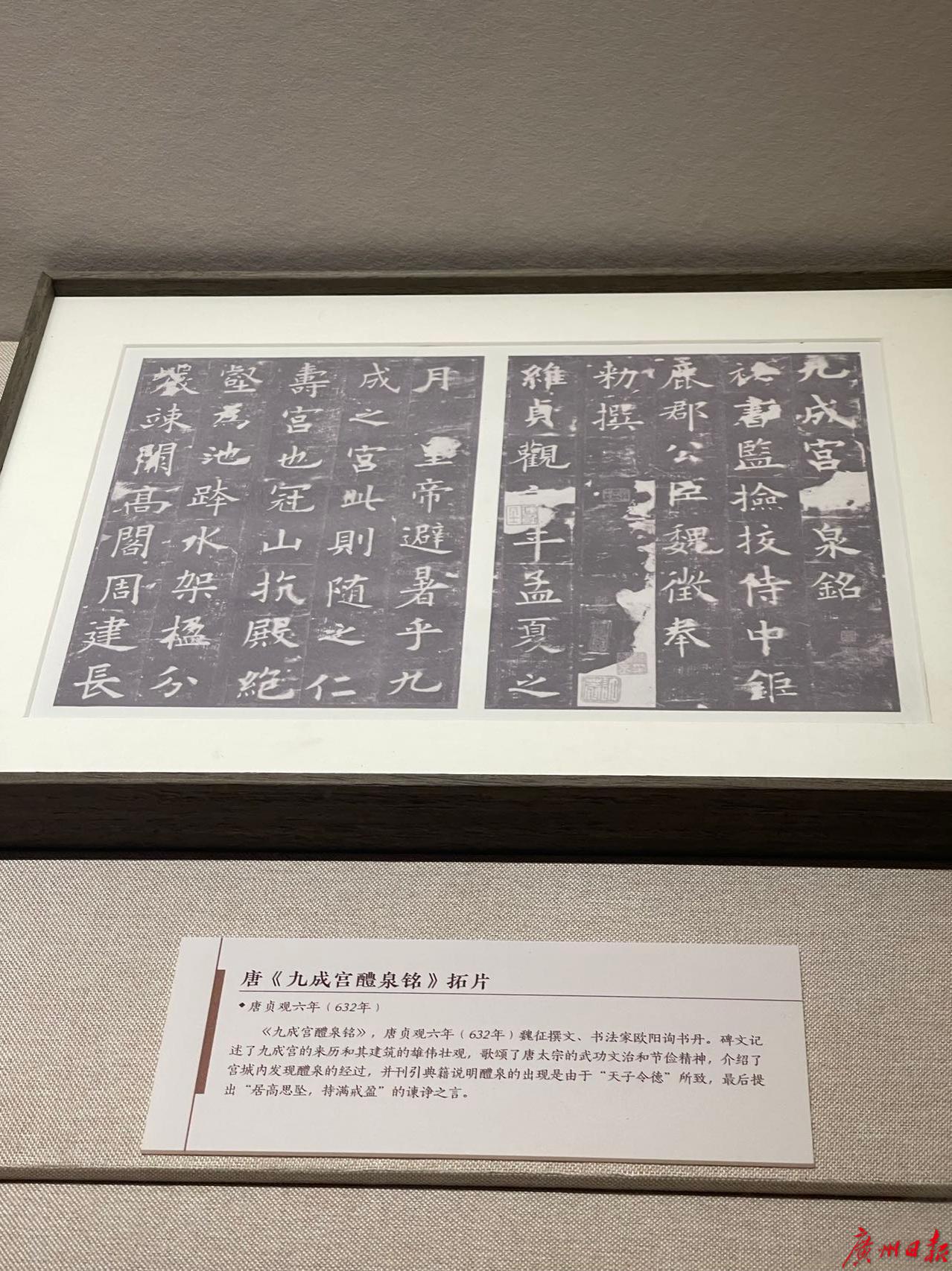 值得一提的是,在广州国家版本馆四大长设展览之一的“千秋写印 华夏有章——中华版本概览”展区里,就能欣赏到匾额上“文沁阁”字体的溯源版本——“唐《九成宫醴泉铭》拓片·唐贞观六年(632年)”,由魏征撰文、书法家欧阳询书丹。