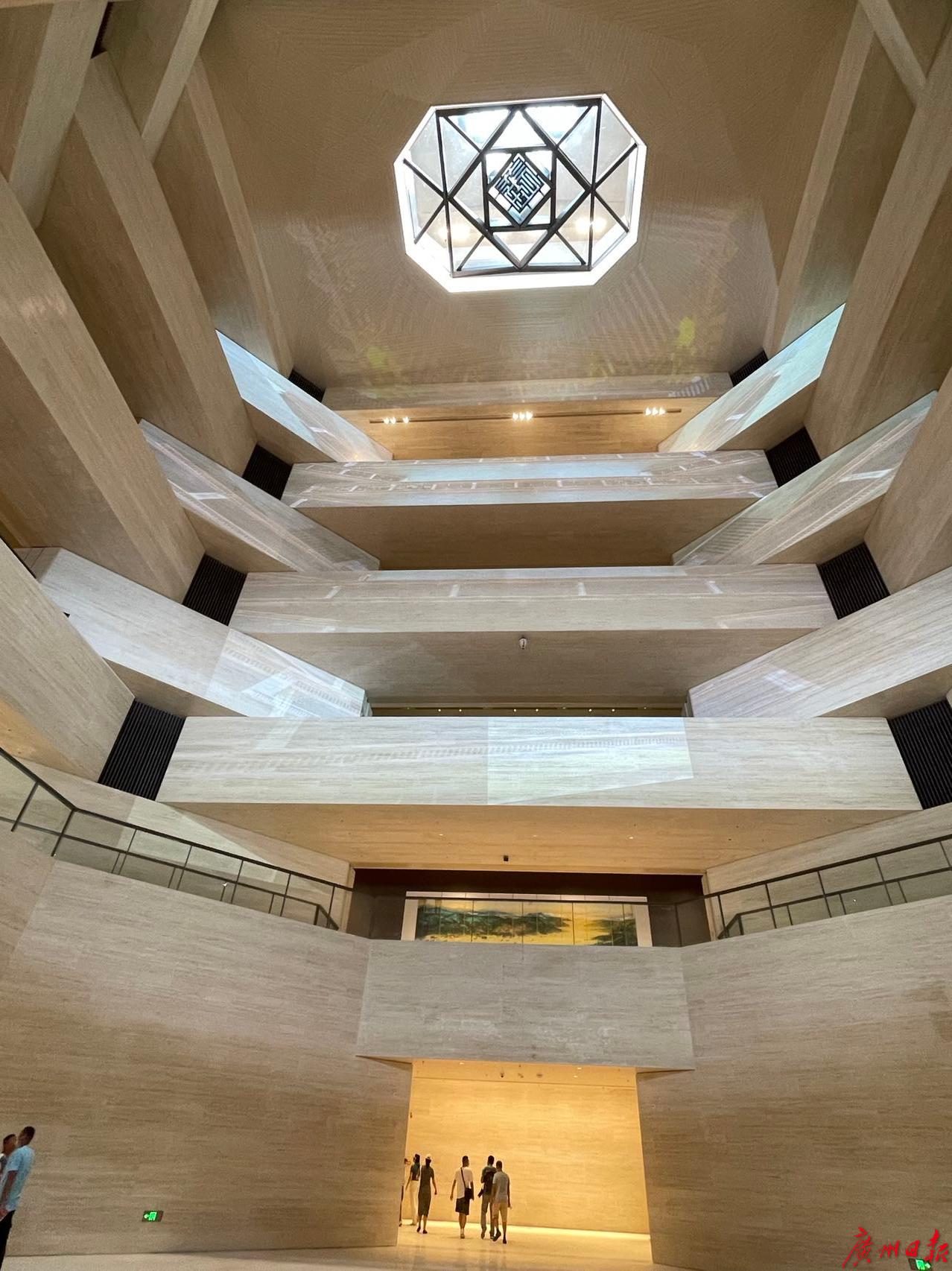 主馆采用双中庭设计,分开上下两个层次。从负一层往上到五层,是一个巨石交错形成的文明基石大厅;五、六、七层是一个自然光浸润的开扬中庭。站在历史的基石上展望未来,来一场“过去”和“未来”的时空对话,这是设计团队想要打造的中庭概念。张振辉表示,借助文明基石巨构这样一个构想,对标文明高地的理念。下中庭往上,是拥有通透天窗的上中庭。“下部的基石中庭,体现着深厚的历史传承积淀,而上部的开扬中庭则更加明亮,能够一览流溪河畔的秀美风光,预示现在和未来,由此构成一种对仗的时空关系。”