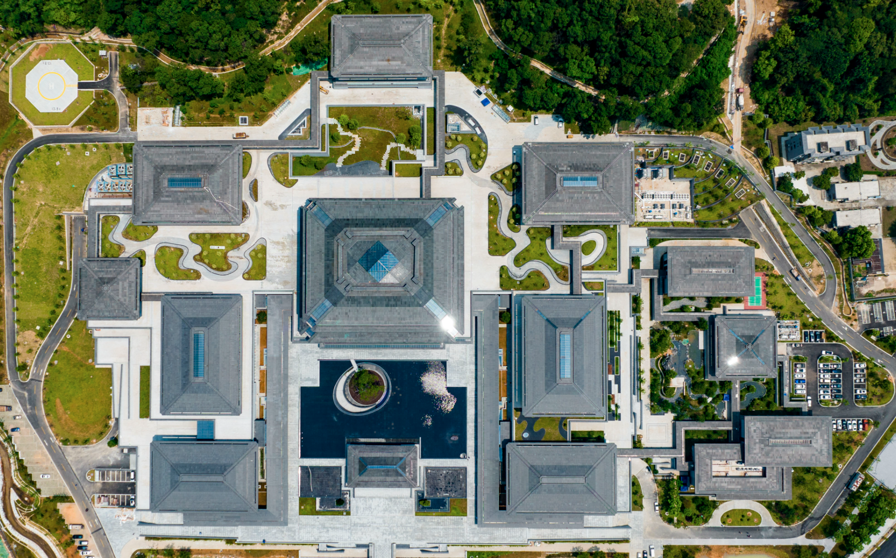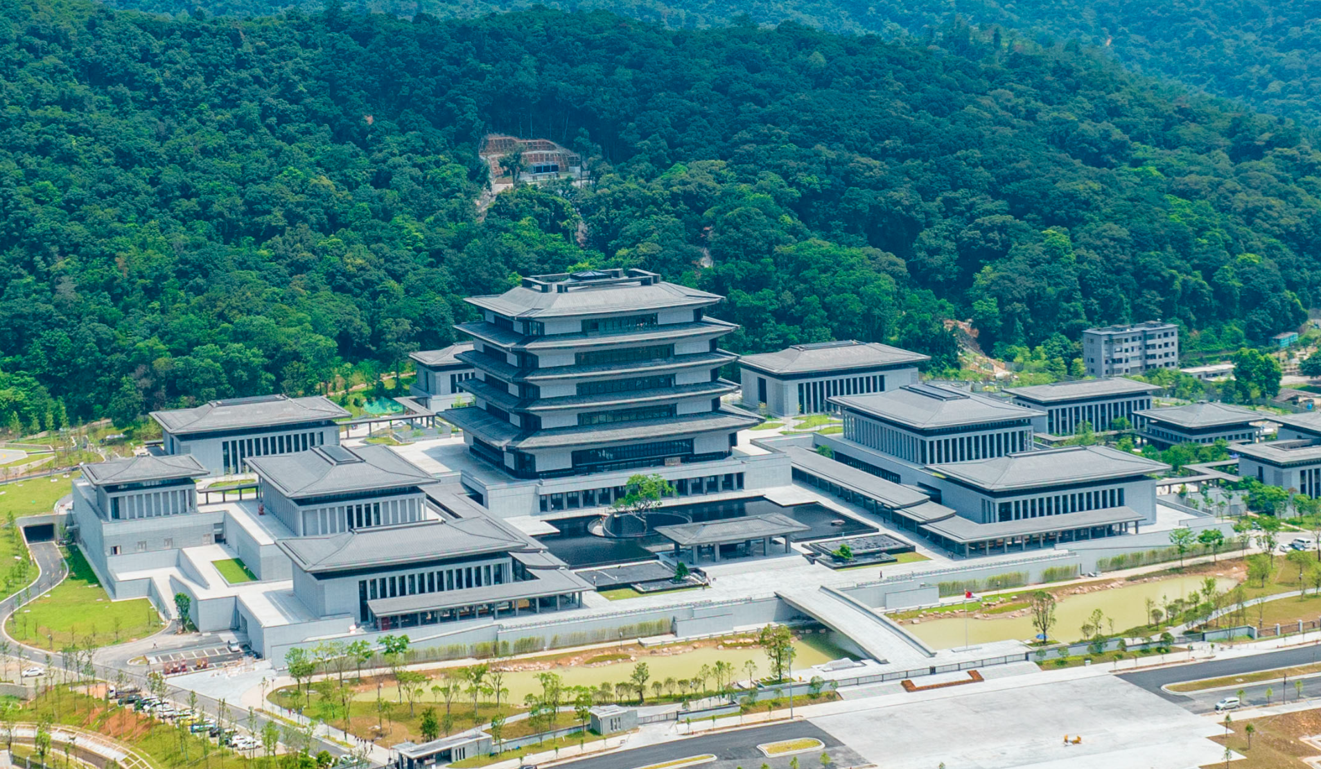 整个建筑群,既处处传承体现岭南文化精神,又敢于创新运用现代材料、技术和审美观念,形成与时代的紧密契合。设计团队放弃传统古建筑繁复的雕砖、雕花等设计,融入落地玻璃、石材幕墙等现代建筑设计,让建筑设计在整体上看上去更为简洁。同时,在色调上又保留了岭南建筑独有的特色,外立面颜色以浅灰、中灰、深灰三种灰色过渡,与青山绿水合为一体,营造出水墨丹青的效果,构造出与水池、植物在视觉上和谐映衬的关系。“从设计的角度看,整个建筑群的颜色都非常注意协调性,把建筑和大自然结合在一起,做到天人合一的效果。”何镜堂说。