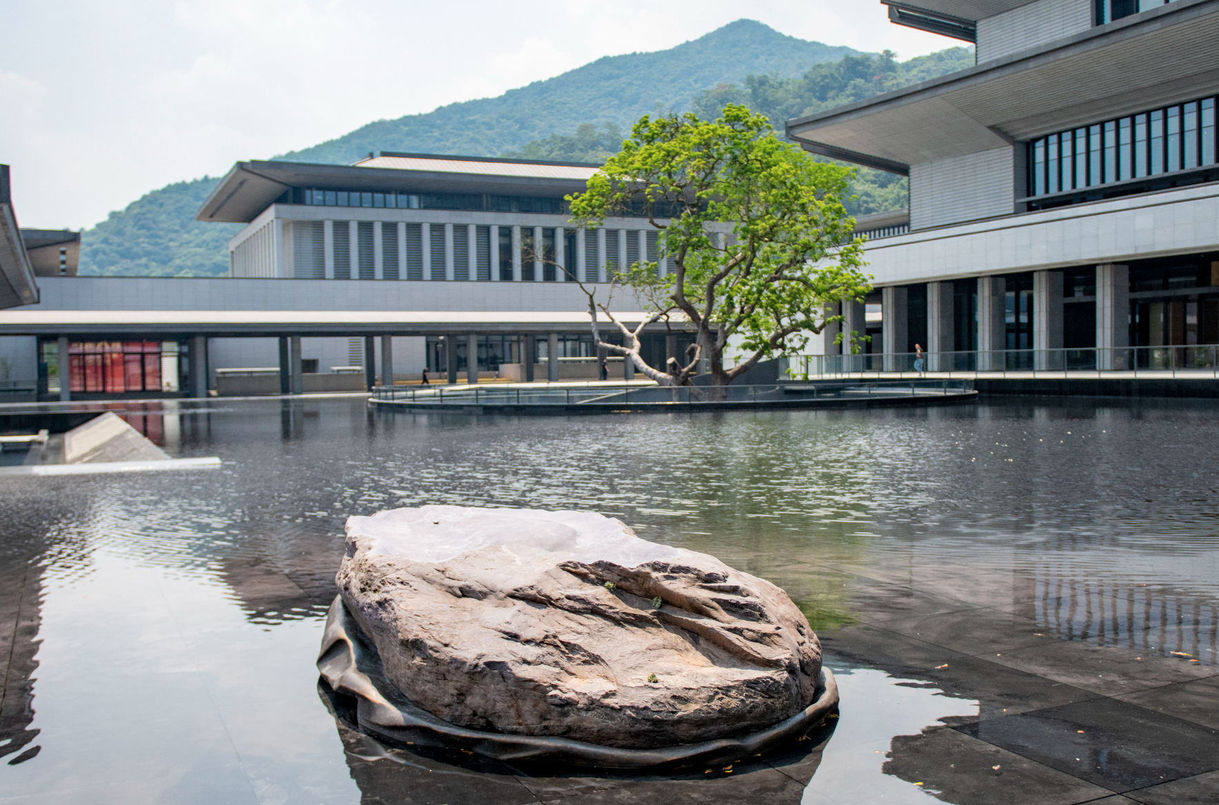 文沁阁主楼前,专门为一棵200多年的原有古树辟出空间。围绕保留古树,设计团队专门调整建筑群的轴线,使中轴线不会正对古树,而是位于水院偏西北一侧,成为建筑群重要的有机组成部分;而位于文沁阁前方的水池,则在池底特别选用了黑色的石材,并在池中安放一尊中国目前最大的端砚。如此一来,矗立的古树格木,恰好与池中墨砚形成“不对称的平衡”组合,在文沁阁主楼、古树和端砚三者之间构造出“你中有我,我中有你”的关系。“可以说,我们很好地完成了上天留下的这一点睛之笔。”