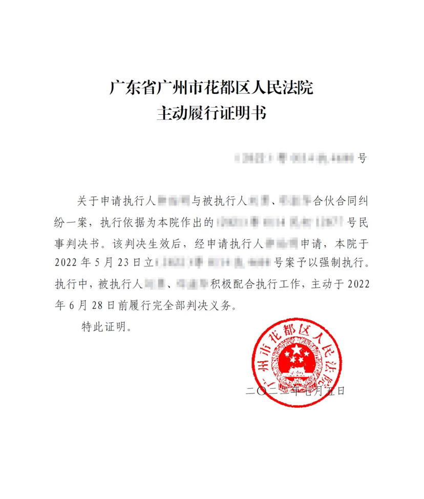 结案后,花都法院向被执行人白某出具了《主动履行证明书》。“有了这份《主动履行证明书》,我可以向银行和合作伙伴出示,不用担心会对公司银行商贷审批、建设项目招投标造成不利影响了。”被执行人白某说。