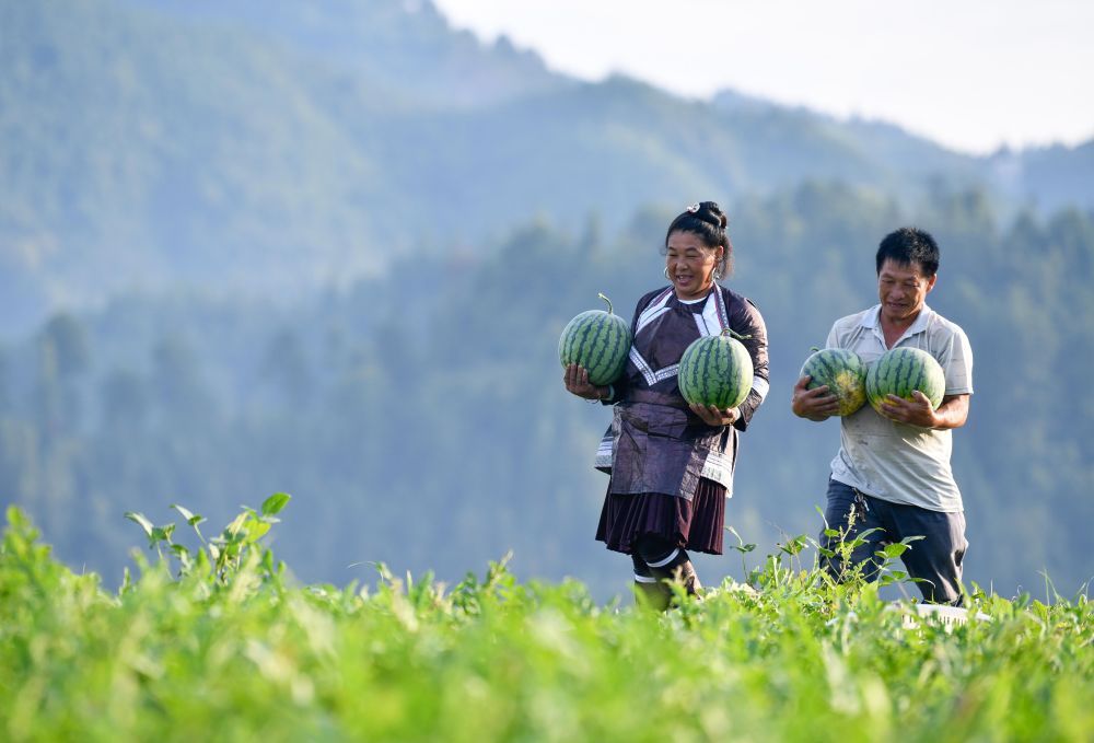7月16日,贵州省榕江县忠诚镇苗本村的农民在梯田上搬运西瓜。新华社记者 杨文斌 摄
