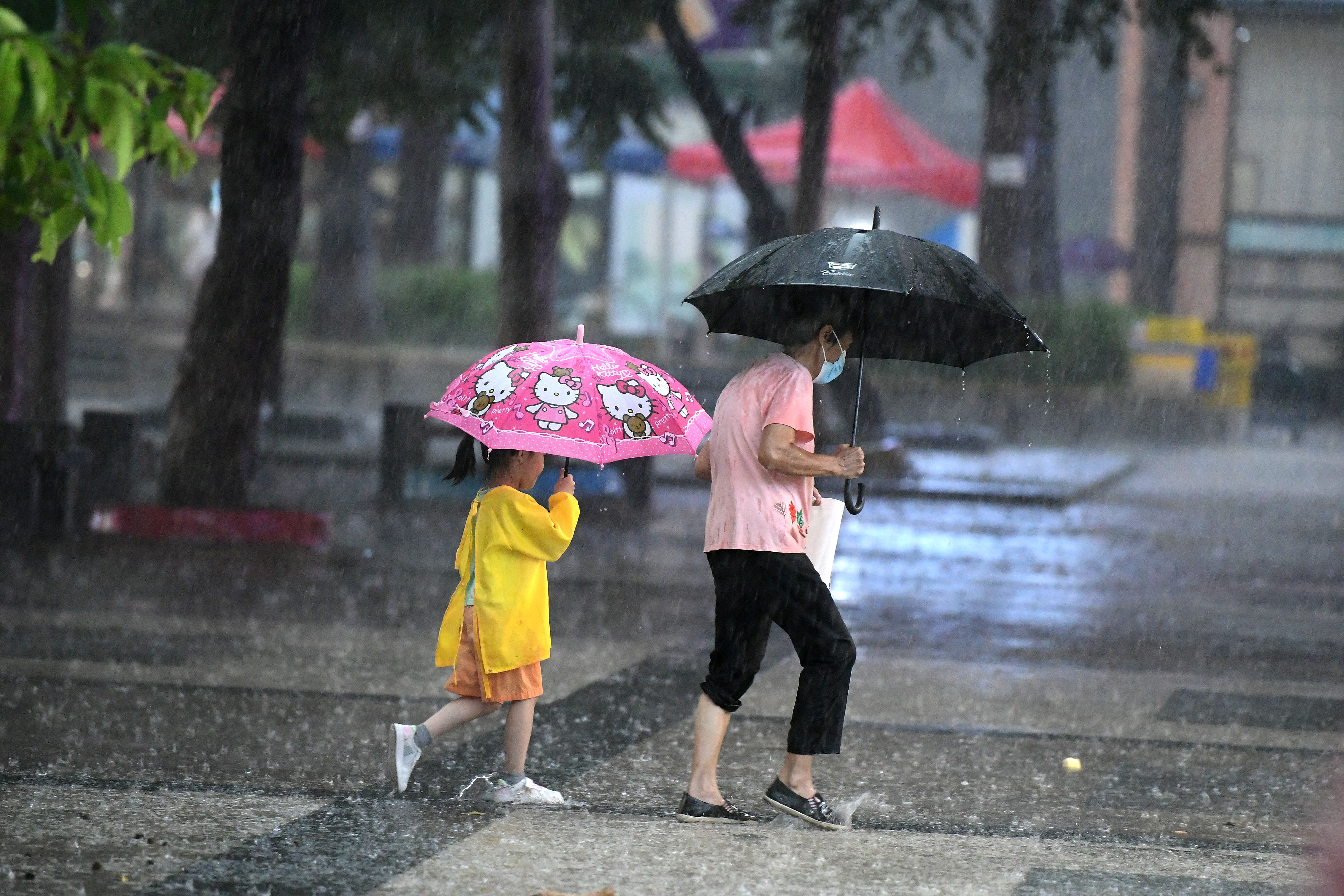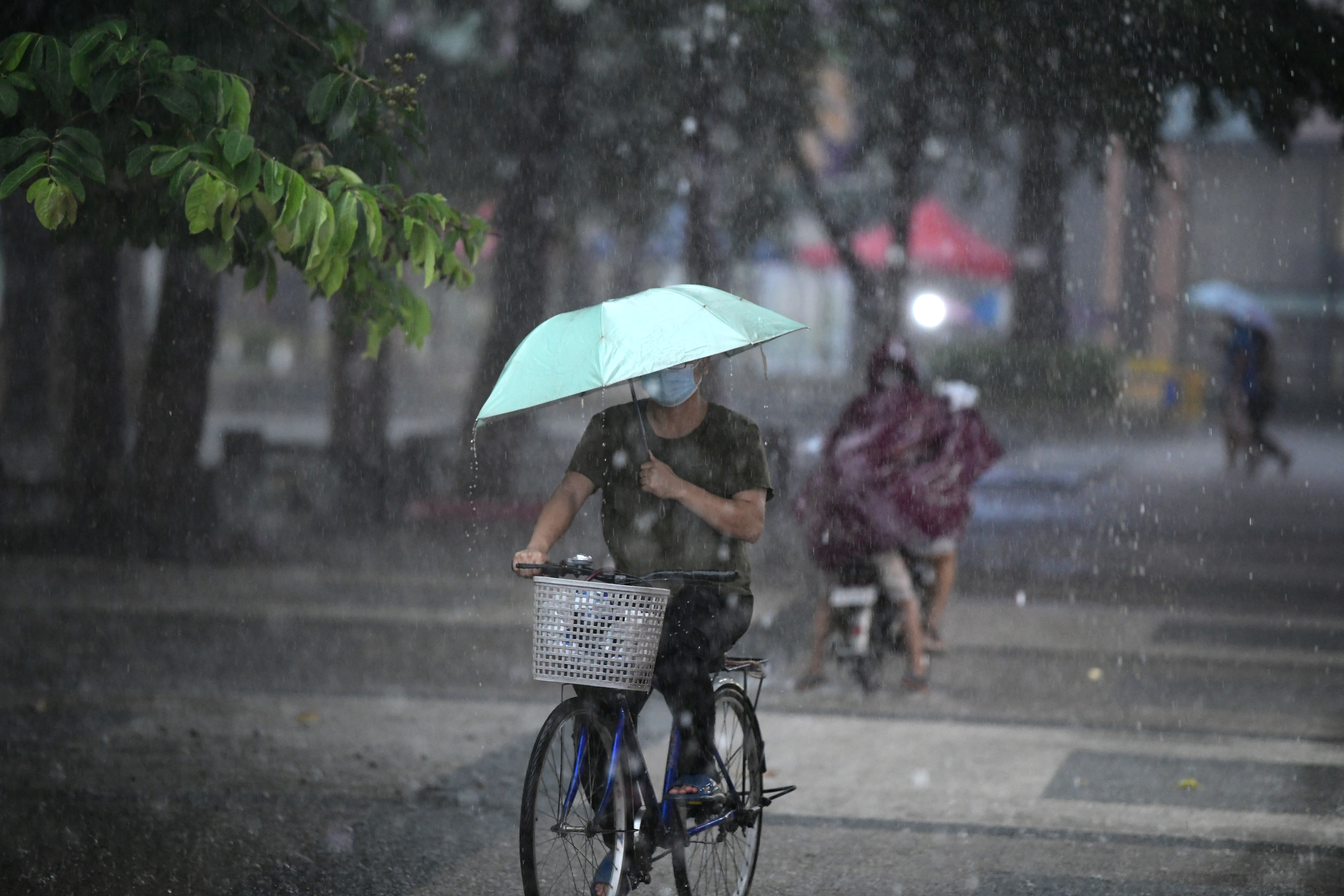 8月3日下午,天河区突降暴雨并伴有短时大风,为持续晴热高温的广州带来了些许清凉,图为市民撑伞冒雨出行。