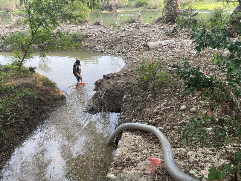 在太平镇瑶村心田组的一大片农田旁,记者看到,农田上种植的秧苗已经晒黄枯死,不少田块已被晒白,一道道裂口清晰可见,灌溉水渠也早已见底。该县应急管理局综合救援大队的队员们带来了2台抽水机电设备,在河道里就近取水,利用抽水机把水引到沟渠,对农田进行抽水保灌,用以满足当前农业生产用水需求。