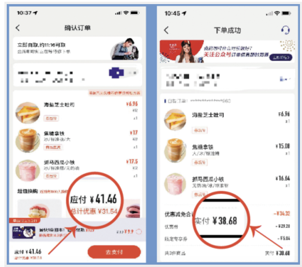 市民李小姐表示,近日她通过自己手机号码下单在家附近的瑞幸咖啡。当天首次下单包括了海盐芝士吐司(1份)、大的冰焦糖拿铁(1杯)、冰的抓马西瓜小铁(1杯),订单页面显示总计优惠31.54元,应付41.46元。其间,因其他事情,她退出上述订单页面,未最终付款。不到1分钟,她再进入到瑞幸咖啡的下单页面,打算继续支付上述订单(同一地址店铺、同样产品)时,她竟发现合计价格变成了38.68元。相比之下,同一订单因李小姐第一次未支付,之后再支付,价格相差了2.78元。“是因为后台发现我第一次下单时没支付,当我复购时就给更多优惠?”李小姐质疑,是否遇上大数据“杀熟”?记者就此情况询问了瑞幸咖啡,至截稿时,后者尚未回应。