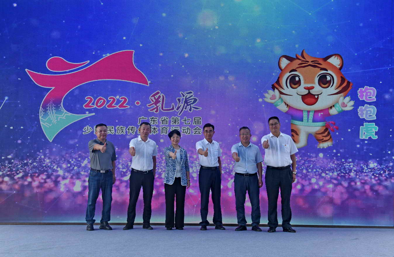 吉祥物:广东省第七届少数民族传统体育运动会吉祥物名为“抱抱虎”,突出民族团结,环抱一团,共奏新时代民族团结新乐章的寓意,其设计以韶关华南虎为原型,体现韶关的生物多样性和生态资源禀赋,以华南虎健硕有力、充满活力的形象,展现出奋勇拼搏、敢于挑战的体育精神和积极向上、奋发进取的良好风貌。“抱抱虎”,体型微胖,敦厚可爱,极具亲和力。虎头虎脑,很有虎(福)气,形象特色更加鲜明。手掌心设计有爱心形状的肉垫,象征着爱与和平。身着男性过山瑶服饰,缀以瑶绣纹样,彰显乳源“世界过山瑶之乡”的特点。姿势呈拥抱的形态,寓意热烈欢迎远方的贵客及民族团结一家亲。