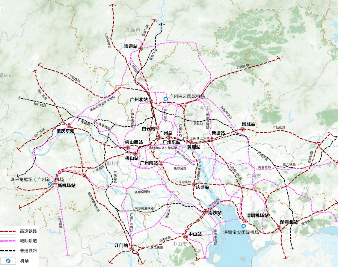 提升广州核心枢纽能级。结合广河高铁、广中珠澳高铁的建设时序,优先建设白云机场高铁站。机场高铁站引入广中珠澳、广河、贵广高铁广宁联络线等高铁线路,实现国际航空枢纽湾区内1小时直达。建设国际铁路枢纽,提升广州核心枢纽能级,建成广州白云站,高水平改造广州东站,推进广州站升级改造,推进广湛高铁佛山站建设,新建广州至广州南联络线、广州至广州东三四线、广州东至新塘五六线。打造都市圈铁路“五主三辅”客运枢纽,形成“十字+环+ 放射”状网络形态,实现都市圈内部辐射带动及对外各向高快速联系。