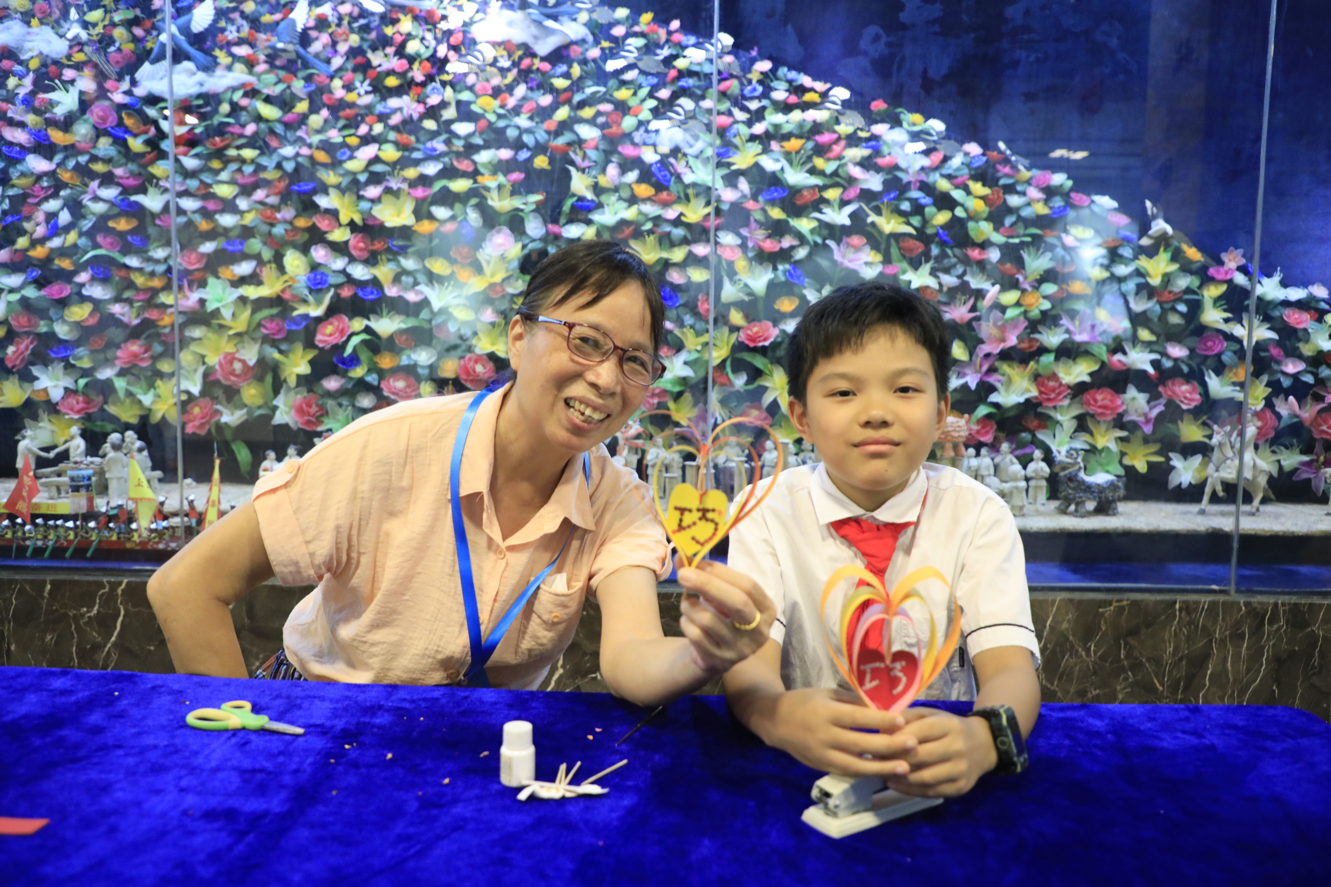 “快点开始吧,我等不及要快点做好送给我的同学了。”在广州乞巧博物馆,潘慧君准备和小学四年级的黄奕铮一起制作《心灵手巧》的作品,小传承人黄奕铮摩拳擦掌,跃跃欲试。在心形彩纸上写上“巧”字,把多彩的长条彩纸弯曲成“心”形,再用订书机钉上,《心灵手巧》就完成了。