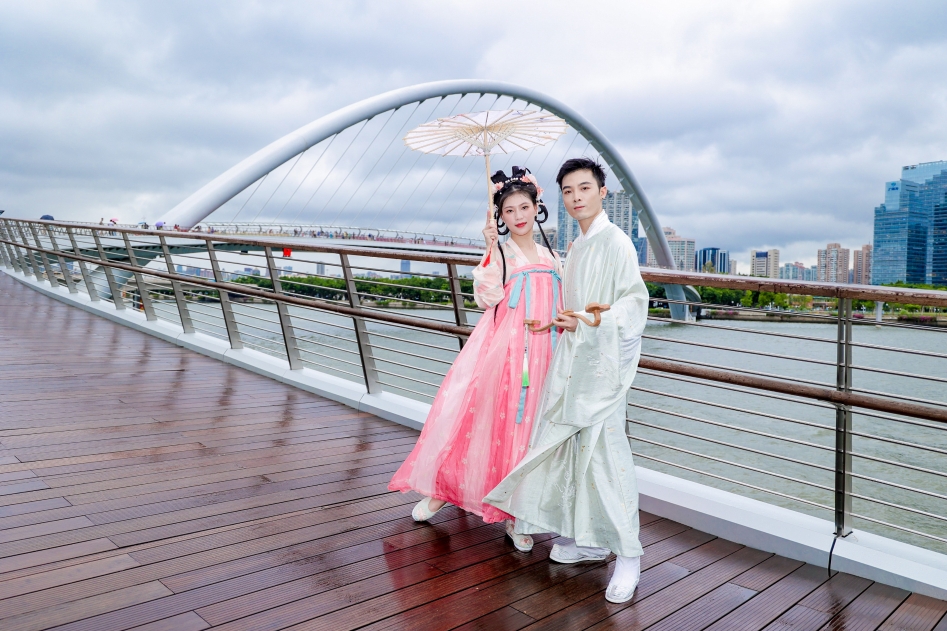 今日傍晚,广州塔在海心桥为广大游客及汉服爱好者带来了一场沉浸式汉服夜游活动。七夕夜,海心桥化身“鹊桥”,为美好的节日带来美人与美景,与君共赏。记者看到,尽管美人着华装,娇美胜画卷,汉服同袍们身着飘逸的衣裳,携手走在海心桥上,共同观赏绚丽的广州塔灯光秀,一起为爱祈愿。