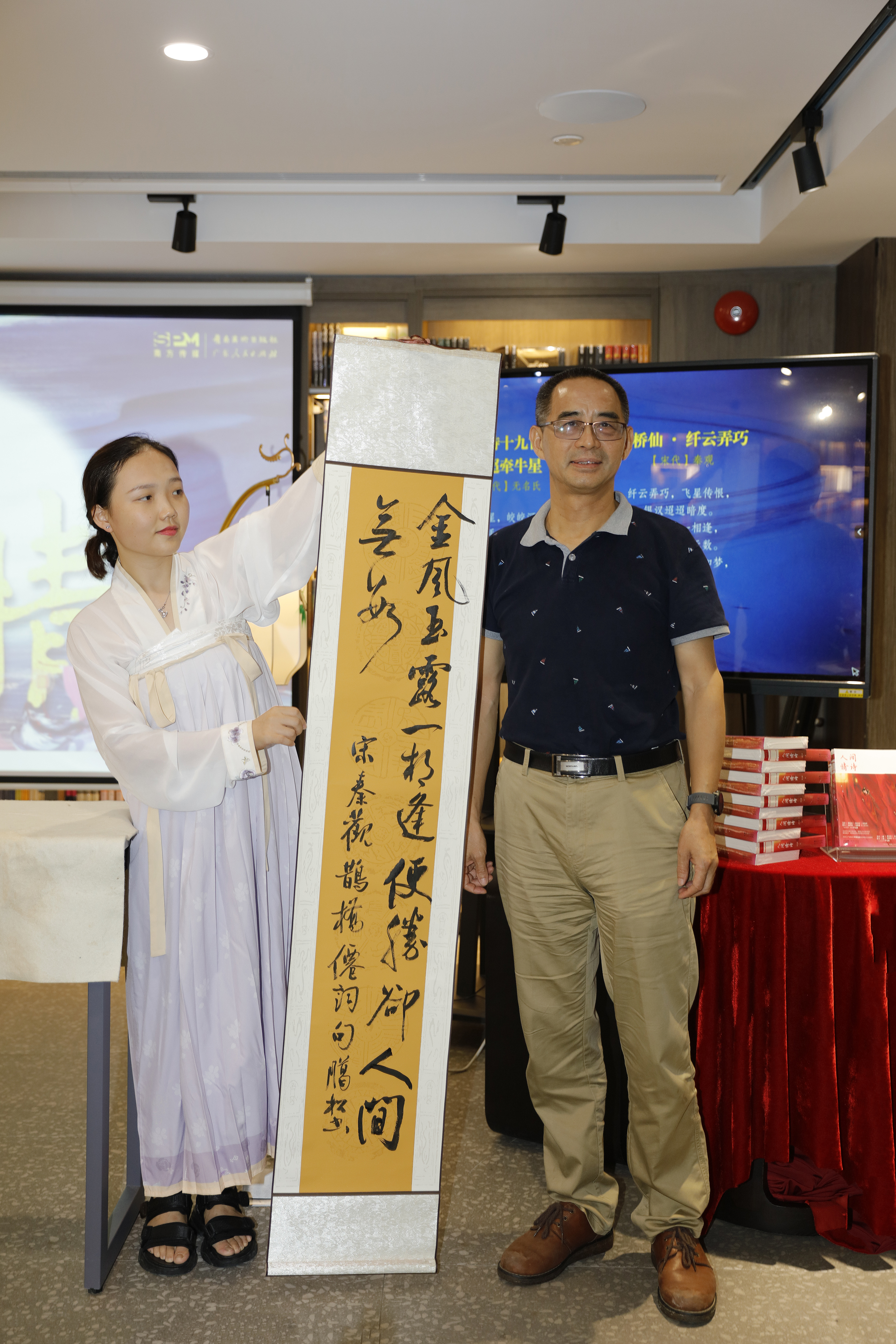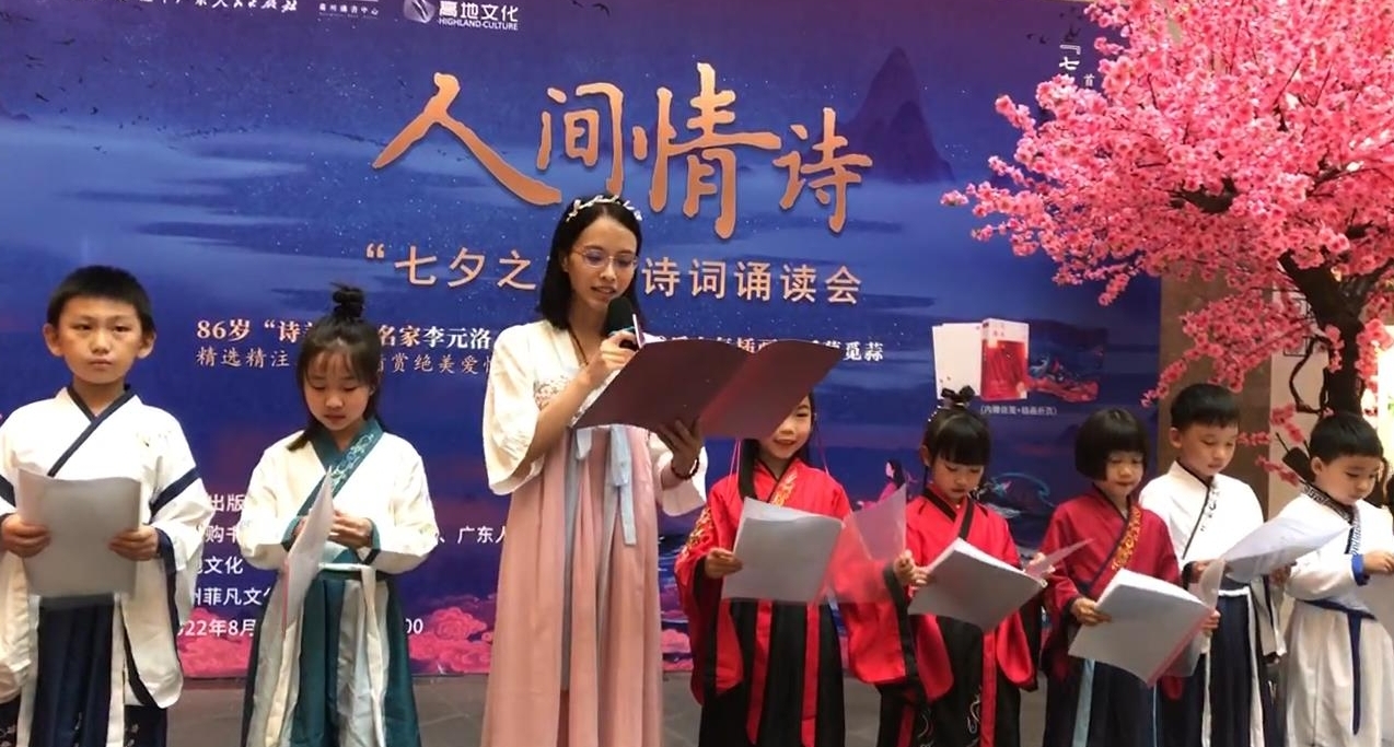 在广州购书中心七夕之夜朗诵会现场,活动在古筝演奏《渔舟唱晚》《长相思》等名曲中拉开帷幕,广州汉服爱好者身着汉服,在音乐声中自由观赏、交流。 9名小朋友在老师带领下诵读《诗经》后,省委宣传部、南方出版传媒、广州购书中心、岭南美术出版社等单位的领导嘉宾在现场完成“拼鹊桥”等仪式。