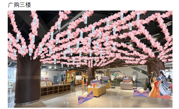 在广州购书中心七夕之夜朗诵会现场,记者发现一楼大厅中心广场位置搭建了3mX5m的活动主题背景墙,运用桃花树等国风元素装饰一楼大厅场景氛围,靠近电梯的视觉中心位置,设置了长达8米长的图书+文创的展示台;在三楼手扶电梯旁的三个中心柱的区域,三个树状的中心柱改装桃花树,利用顶面树状结构搭建成“十里桃林”的视觉效果。在中心位置用《人间情诗》的图书搭成“鹊桥”状的书花造型,市民大呼:这样的七夕布置,爱了!