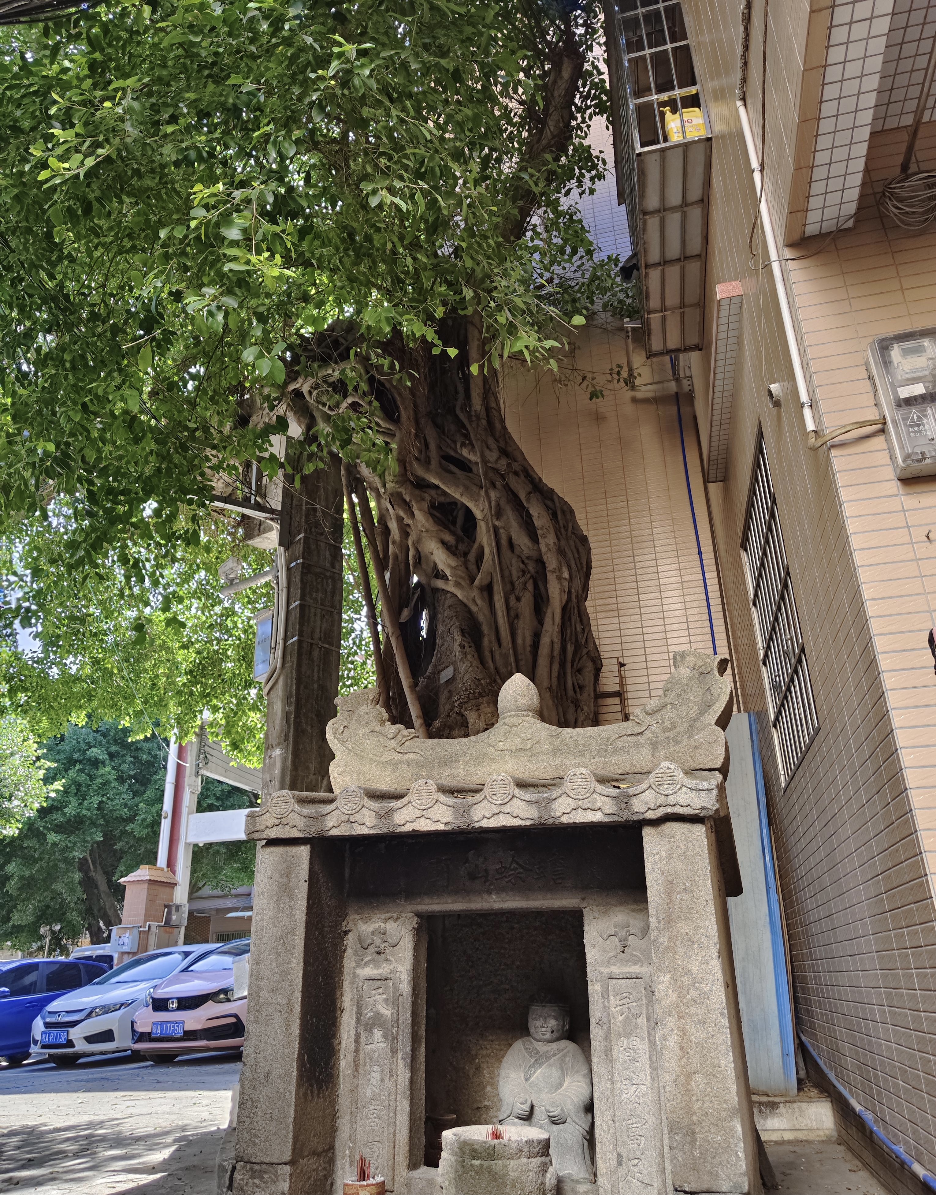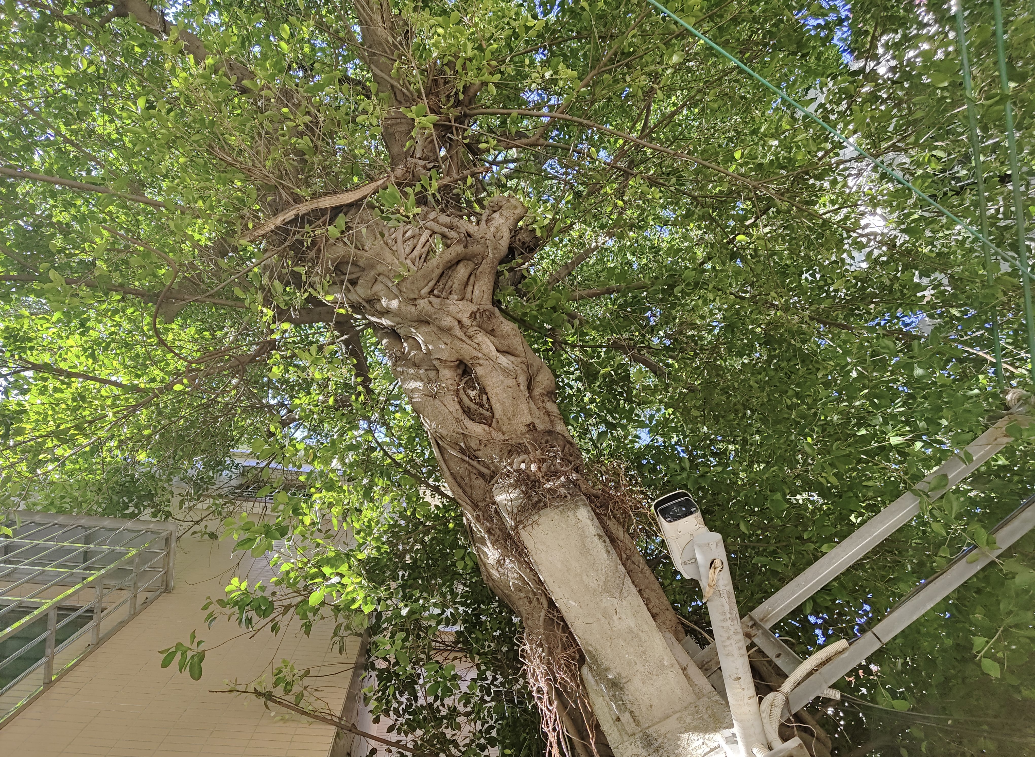 在村民的指引下,记者见到了这棵古榕树,它紧靠在一座居民楼旁,虽然周边已被楼房环绕,挡住榕树部分的伸展空间,但其依然努力向阳生长,枝叶郁郁葱葱,远远望去,宛如一把绿绒大伞,树下盘根错节,枝干虬曲苍劲,刻画着岁月的皱纹。