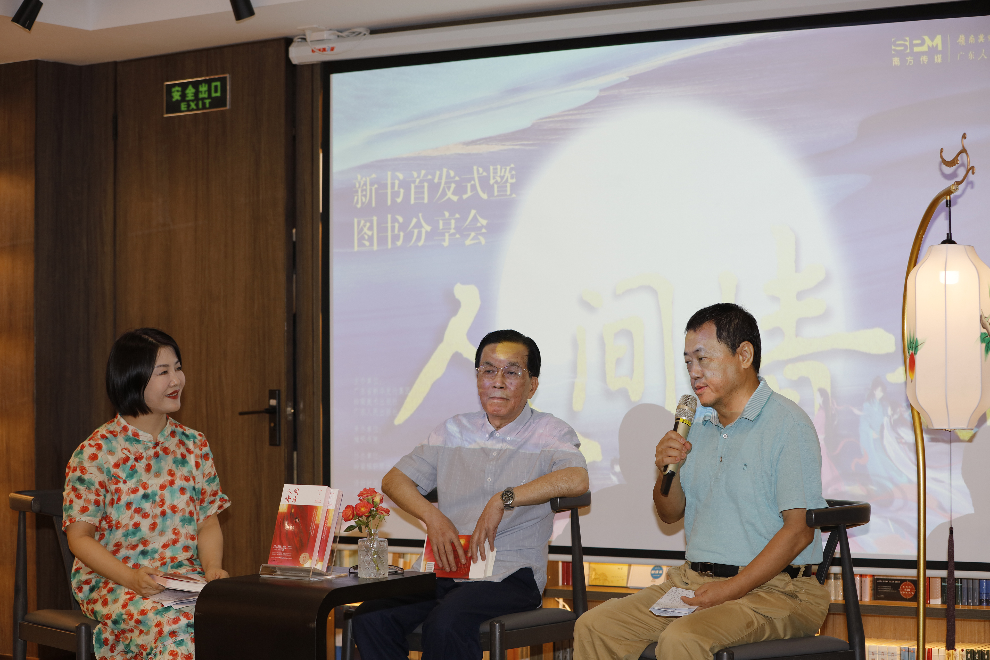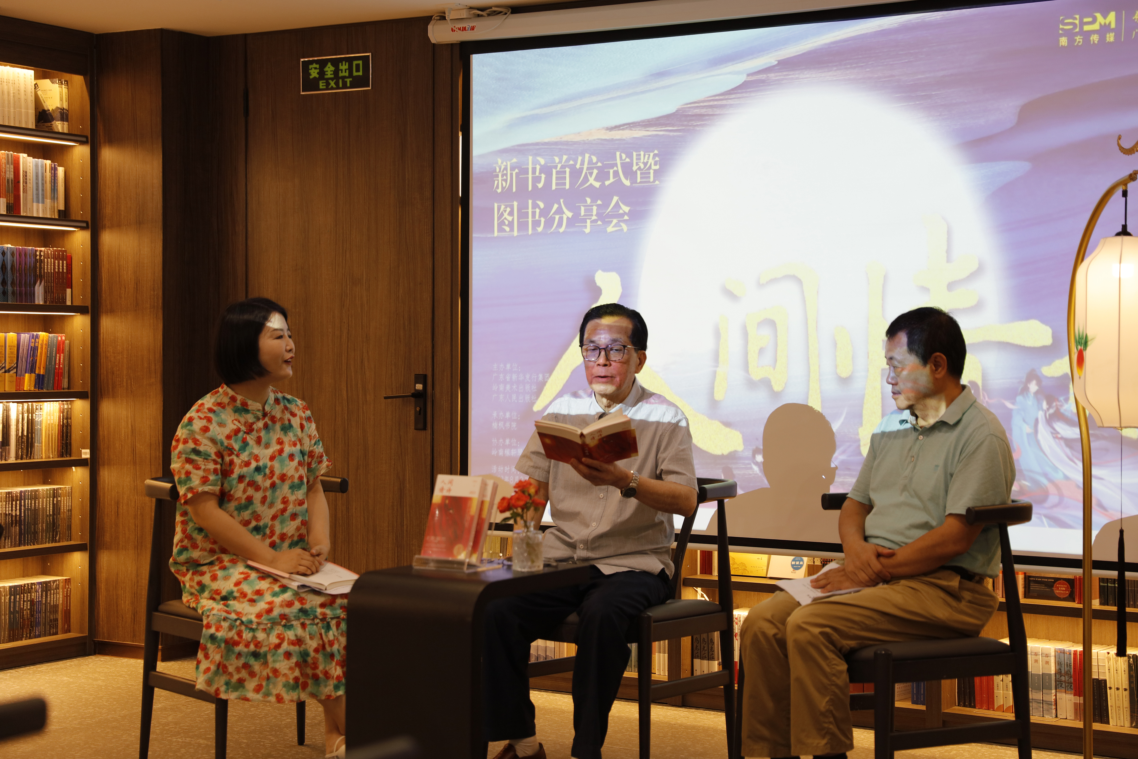 在古琴老师李德荣弹奏中、岭南稼轩琴坊的郑旭纯老师用粤语声情并茂地朗诵了《长相思》,将活动带入嘉宾访谈环节。中华诗词学会发起人李经纶和中国教育学会小学语文教学专业委员会常务理事、广东省教育研究院杨建国两位老师,谈《人间情诗》出版意义及李元洛诗词成就,以及如何读古诗,如何感受古典诗词之美等,并现场互动,解答读者提问。