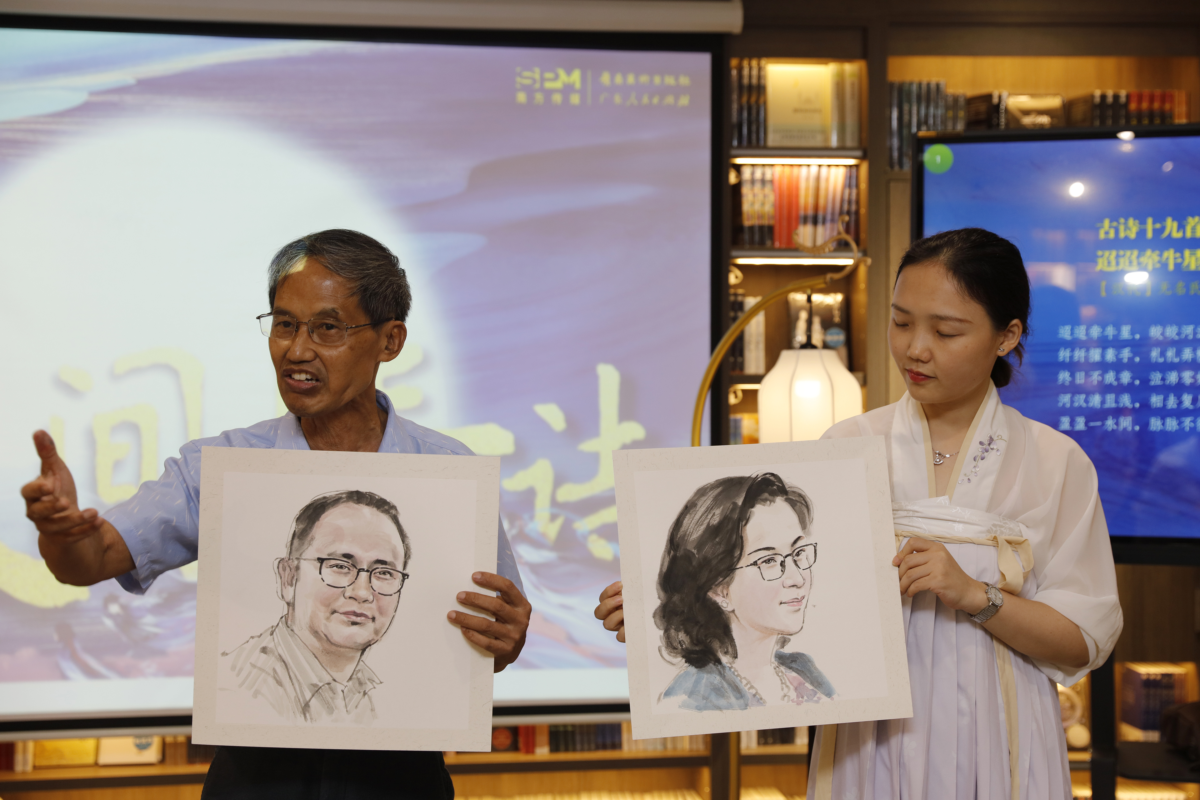 嘉宾倪腊松现场挥毫,写下“金风玉露一相逢 便胜却人间无数”的书法作品送给幸运读者;嘉宾陈挺通老师现场为嘉宾绘画水墨人物肖像。展示了中国人兴于诗、立于礼、成于乐的追求。