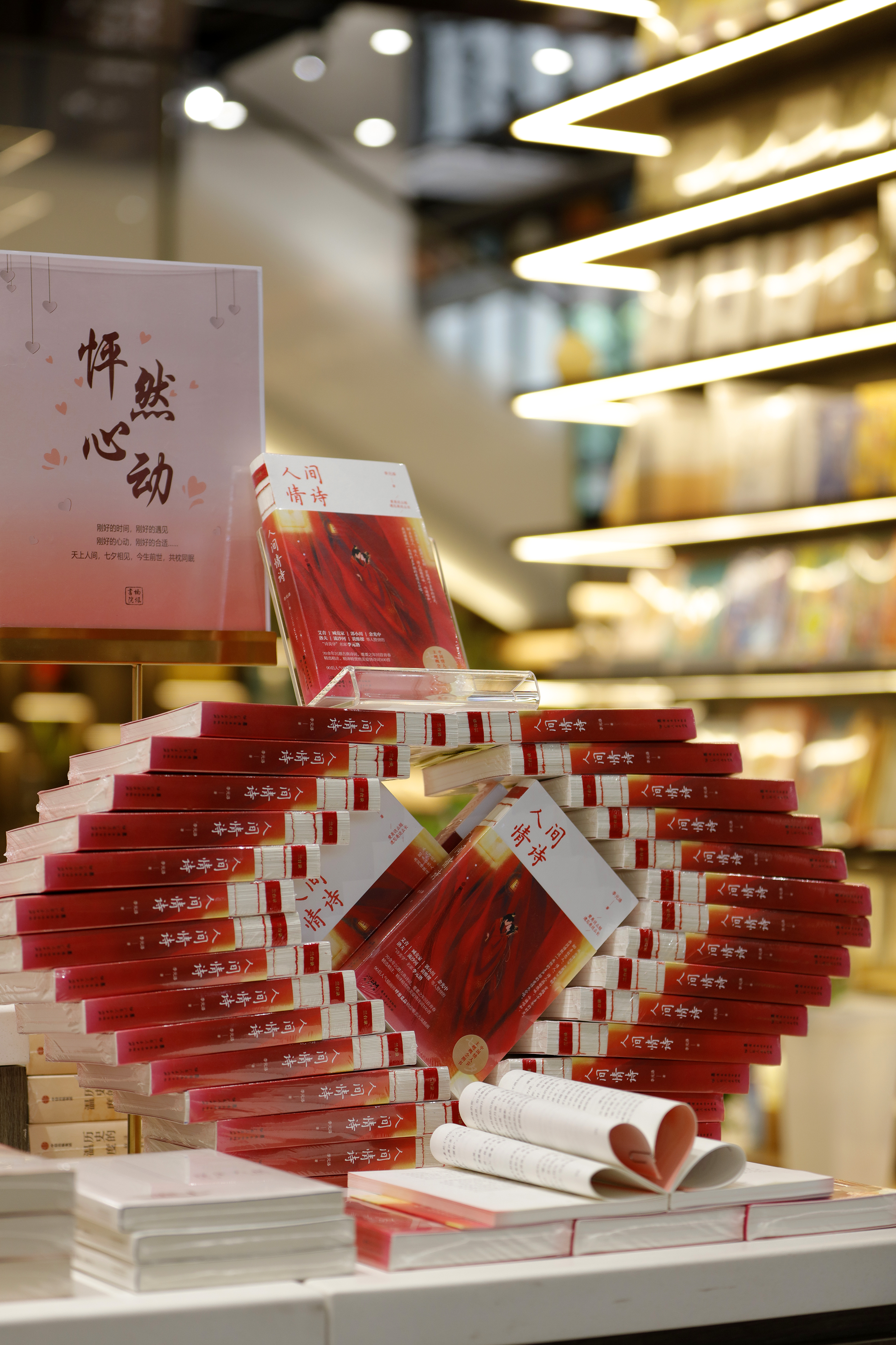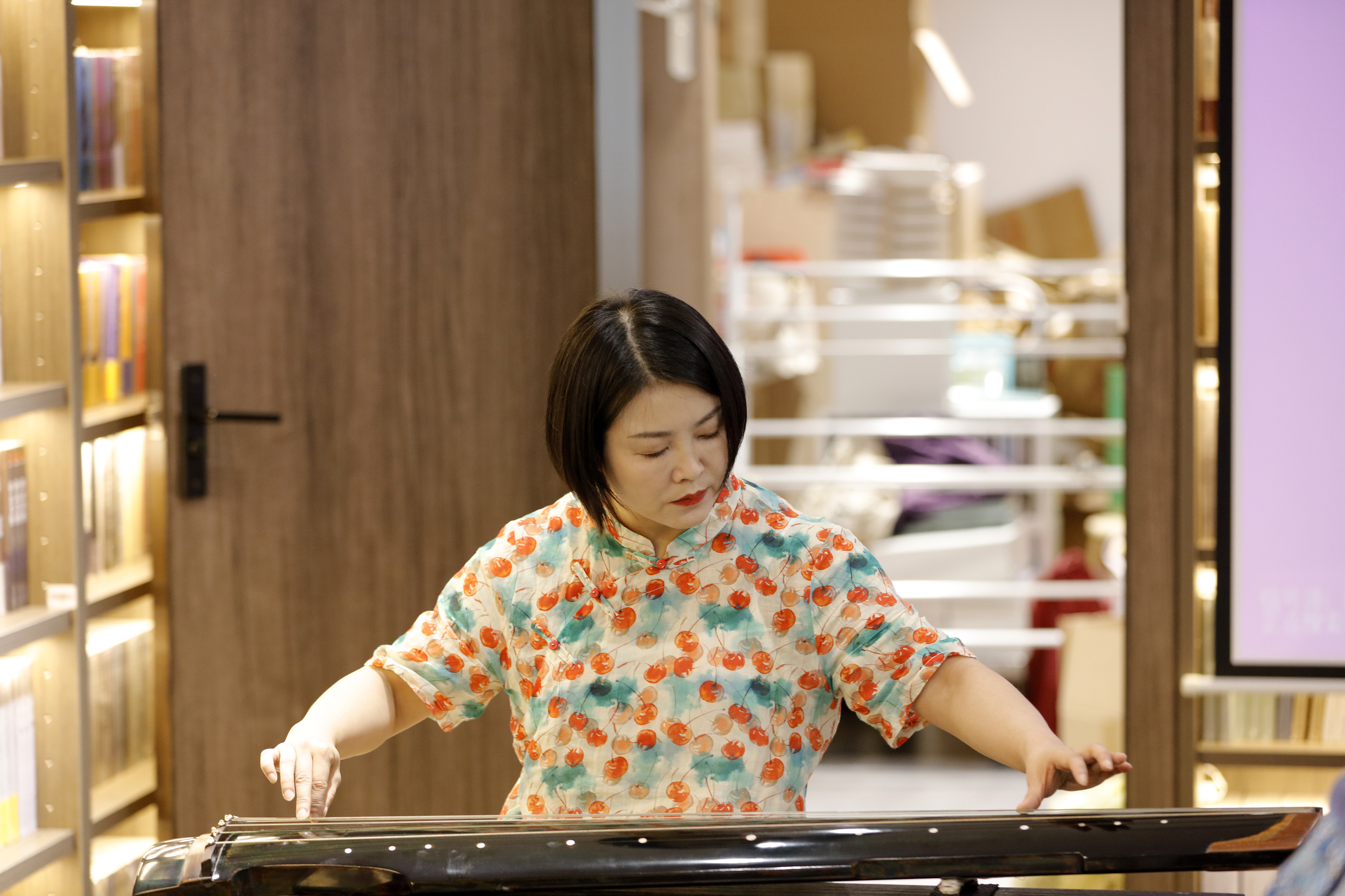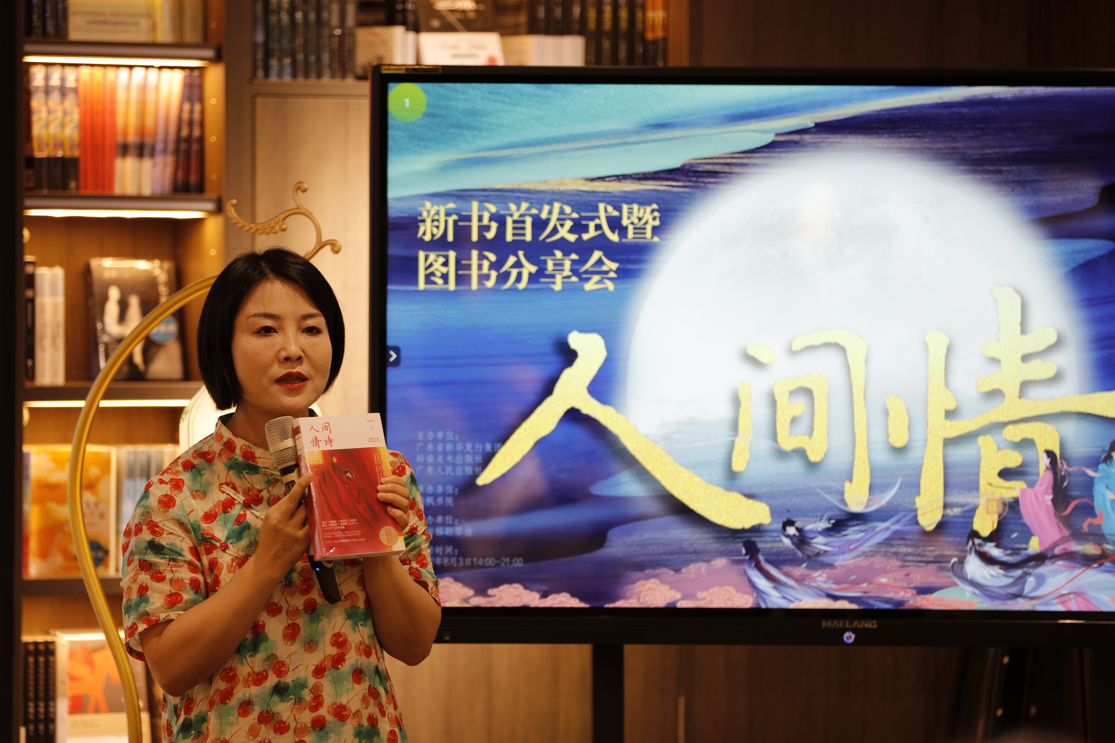 在一楼展示区,有用近200册《人间情诗》搭建的鹊桥造型,让人眼前一亮。在书院二楼活动区域,温馨的立式灯笼、海报、电子屏幕等视觉元素,瞬间可以将人带入古典诗画的沉入式体验。活动由岭南美术出版社副社长谢海宁主持,她同时也是一位古诗词与古琴爱好者。谢海宁副社长以李白的《秋风词》改编的古琴曲拉开本次活动的序幕,整场活动由《人间情诗》首发式和嘉宾访谈组成。
