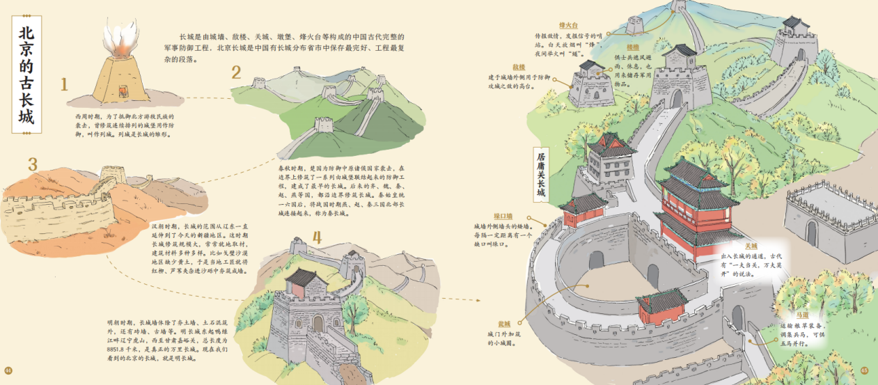 而《北京》则介绍了古长城。从西周一直到明朝,将长城各个时期的沿革讲得十分透彻。还以居庸关长城为例,把它的建筑特点、各个结构的作用一次性讲清。
