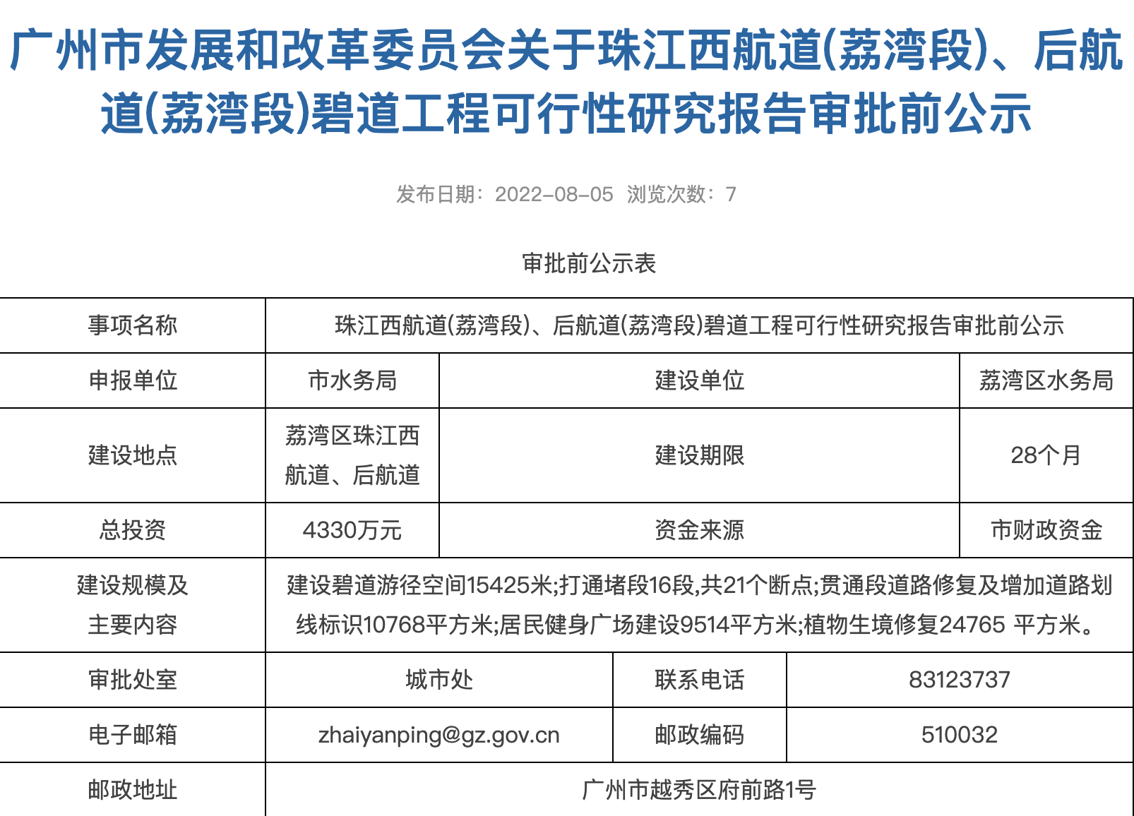 8月5日,广州市发展和改革委员会对珠江西航道(荔湾段)、后航道(荔湾段)碧道工程可行性研究报告进行审批前公示。公示显示,碧道将在荔湾区珠江西航道、后航道建设,总投资达4330万元,建设期限为28个月。