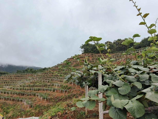 猕猴桃种植基地位于澄江镇暖田村花山组,放眼望去,一层层猕猴桃架分布在各个山头,整齐有序。成片的绿色猕猴桃叶在蓝天白云下显得格外打眼。在猕猴桃藤的架子下,密密匝匝全是鸡蛋大小的猕猴桃,团团簇簇,个个饱满鲜嫩,十分喜人。据了解,基地种植的猕猴桃共有红心、武直、徐香和黄金猕猴桃四个品种。