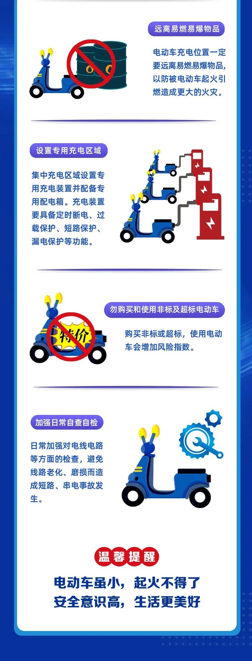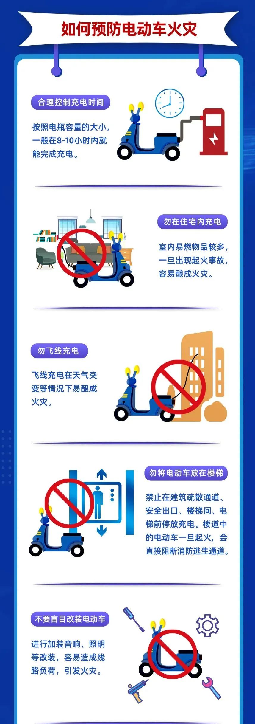 电动自行车虽然便利,但私拉“飞线”充电、整夜充电、违规在安全通道停放电动自行车等危险行为极易引发火灾!