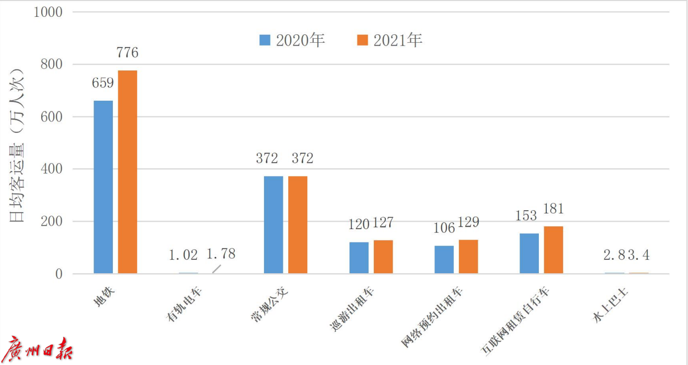 近日,广州市规划和自然资源局发布了《2021年广州市交通发展年度报告》(下称《报告》)。《报告》显示,广州国际综合交通枢纽地位进一步巩固,白云机场旅客吞吐量连续两年位居全国第一,港口货物及集装箱吞吐量保持正增长。此外,2021年,广州城市交通出行总量复苏,已恢复到疫情前2019年正常水平。其中,步行和自行车出行受到青睐,中心城区骑行(自行车、电动自行车)总量较疫情前增加42%,2021年广州中心城区绿色出行比例78%,居全国超大城市前列。