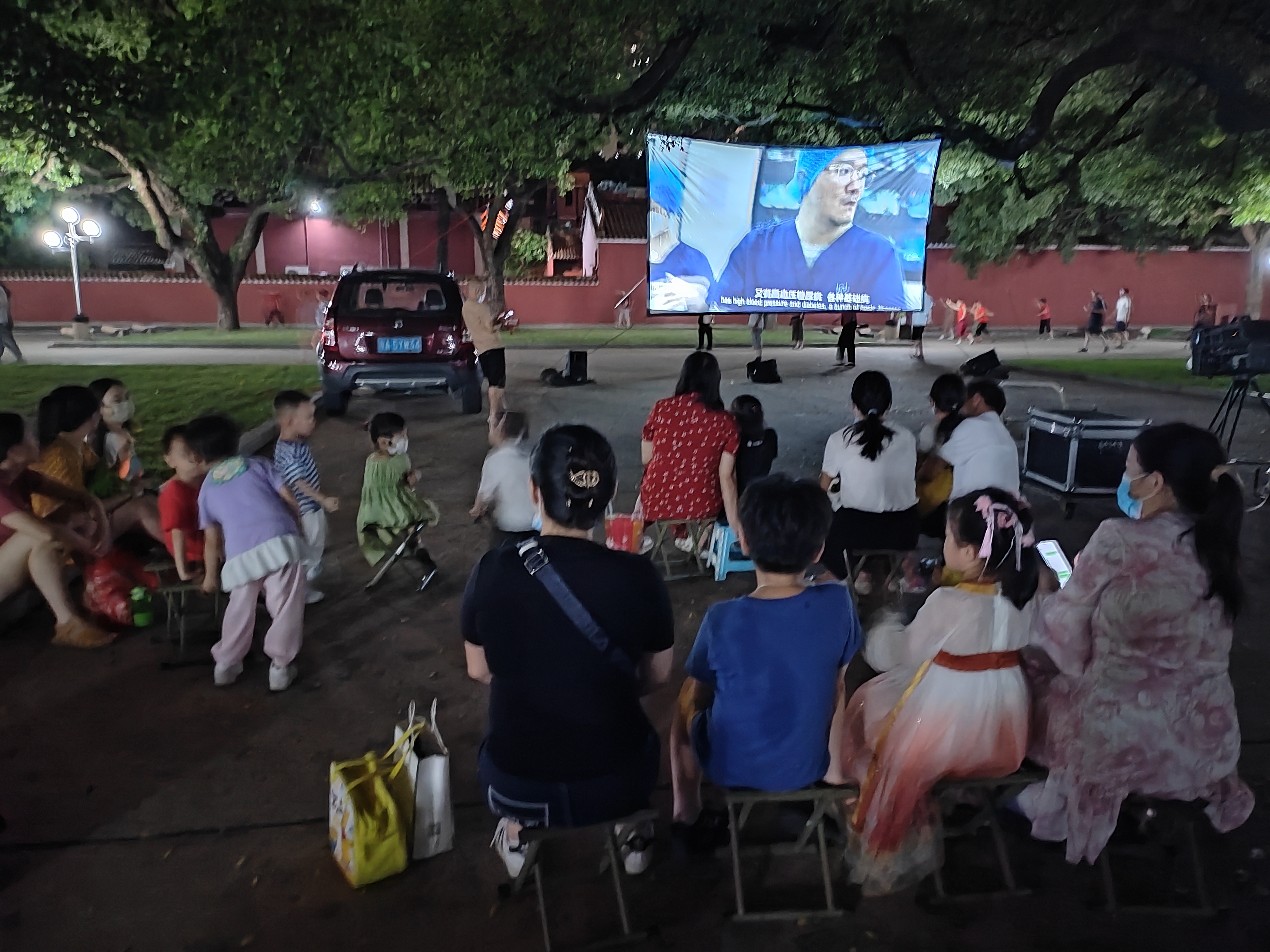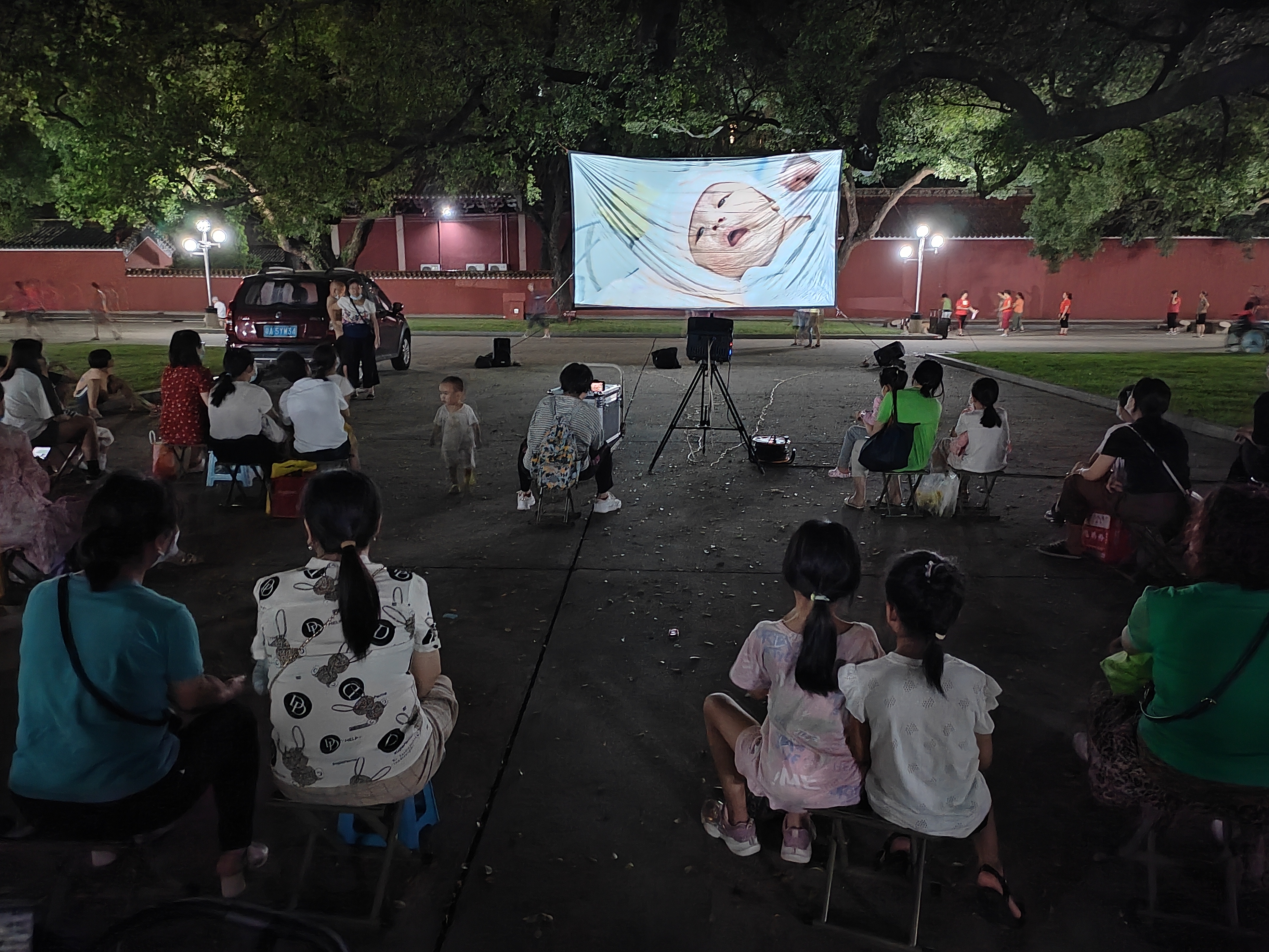 前两日的雨水驱散了连日的酷暑,让广场上显得格外舒服。很多街坊坐在旁边的草坪路牙石上,或者小马扎、便携椅上,安静地欣赏电影。围着大草坪和大榕树,很多人散步、跑步,浓浓的生活气息。