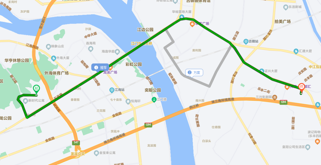 地方道路分流路线:东海路—五邑路—江海五路—新兴大道西—岐江公路—同兴南路—岐江公路—长安北路