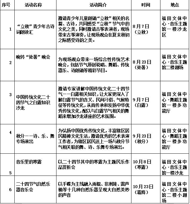 本次活动现场将邀请青少年儿童朗诵“立秋”相关的名篇、古诗,共同感受“立秋”节气中的文化之美,同时邀请古筝表演者,现场带来古筝演奏,让现场观众在夏末秋初之际感受诗韵之美。 而8月23日,“处暑”节气将登场。晚转“处暑”晚会将在福田文体中心·音乐主题馆二楼剧场亮相,将为现场观众带来一场综合性传统艺术晚会,包括节气原创说唱、舞蹈、传统器乐、诗朗诵等精彩节目。 具体活动详情可关注“福田文体中心”微信公众平台。