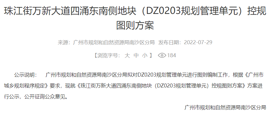 近日,广州市规划和自然资源局南沙区分局挂网公示《珠江街万新大道四涌东南侧地块(DZ0203规划管理单元)控规图则方案》。