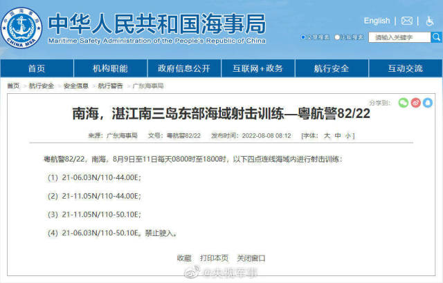 据中国海事局网站消息,广东海事局发布航行警告,8月9日至11日每天8时至18时,南海湛江南三岛东部海域进行射击训练,禁止驶入。