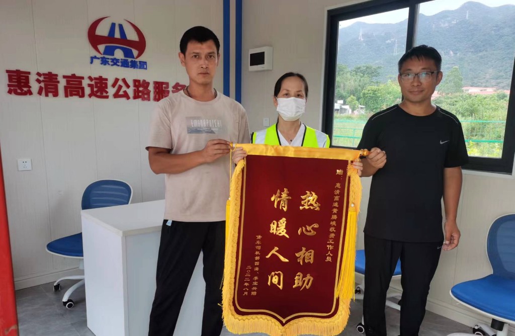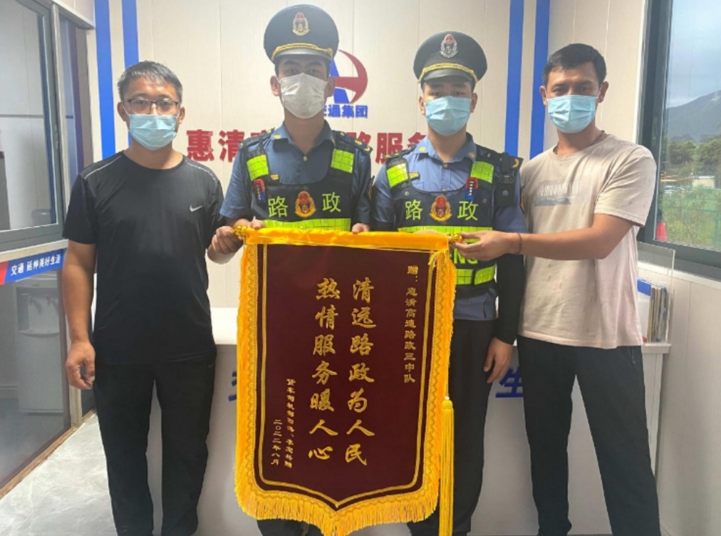 8月8日,货车司机郝先生、李先生为广东交通集团所属惠清高速黄腾峡站、路政三中队有关工作人员送来了两面锦旗,上面分别写着“热心相助 情暖人间”“清远路政为人民 热情服务暖人心”,以表达感谢之情,帮其挽回了一部分经济损失。