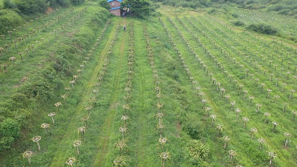 走進綠森園林種植場,可以看到一排排水泥柱順着地勢整齊排列,枝條順着柱子攀緣向上,一顆顆紫紅色的火龍果,像紅燈籠般掛在枝條上,紅綠相間,賞心悅目。