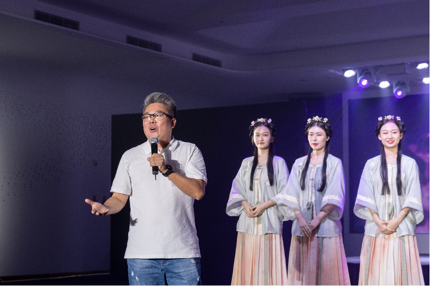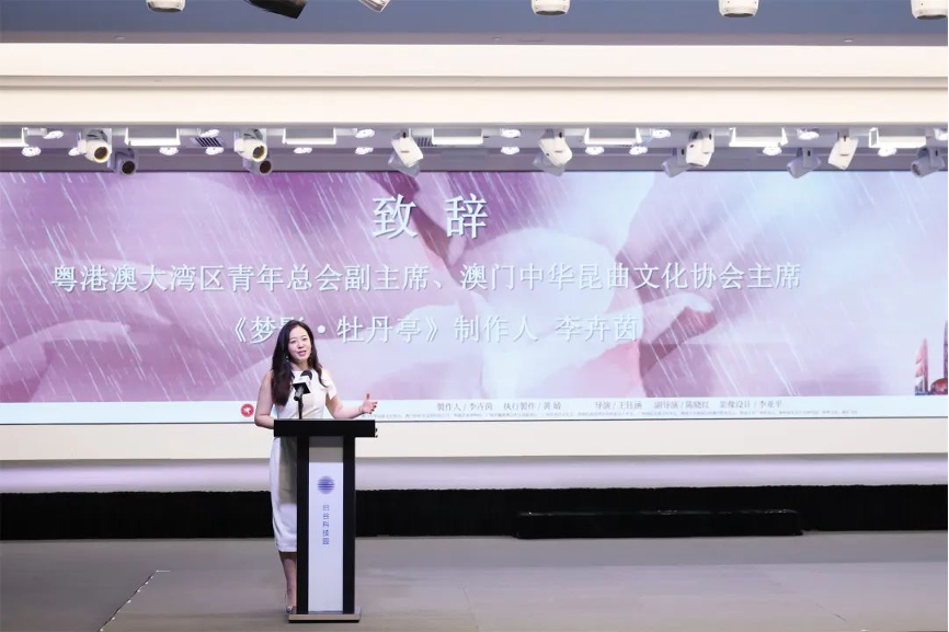 粤港澳大湾区青年戏剧协会会长李卉茵在致辞中介绍:《梦影·牡丹亭》这部新颖的昆话剧将传统艺术潮流化,通过光影艺术打造跨界世界戏剧珍品,为观众带来具有澳门特色的作品,提供中西交融的全新昆曲观演体验。