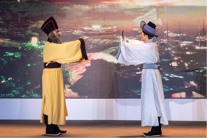 国家二级演员李跃辉饰演的汤显祖(右)与青年演员李禹锋饰演的利玛窦(左)有多场对手戏