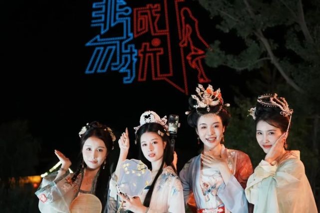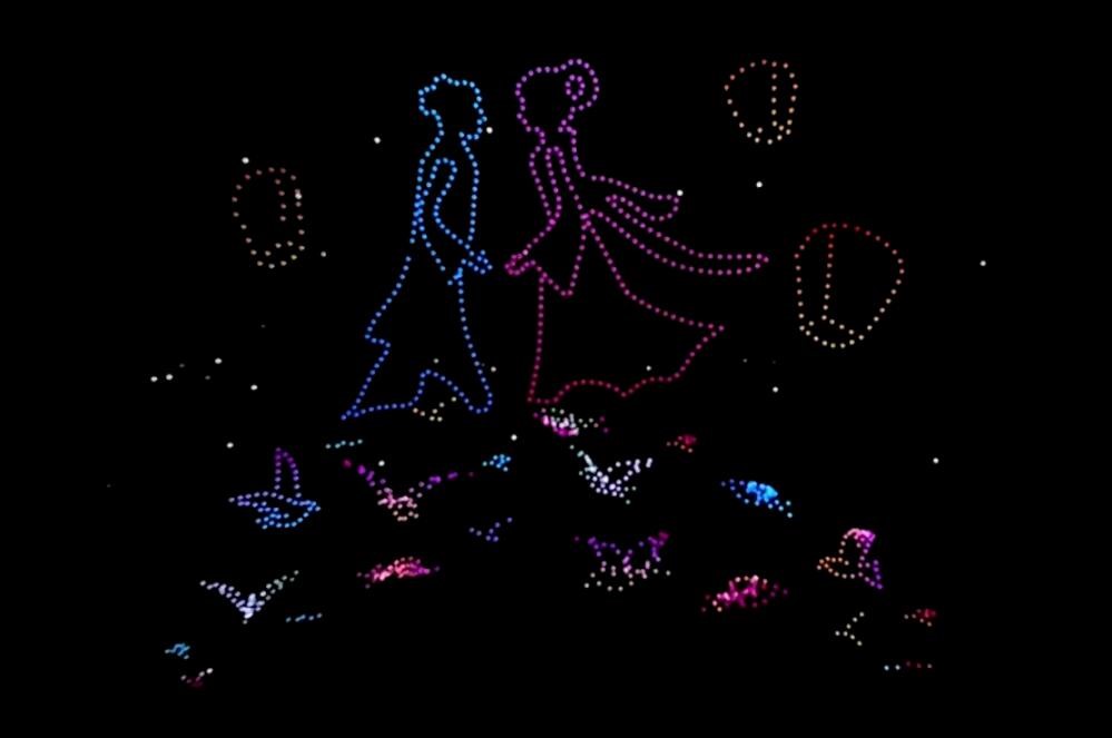 活动中,江苏卫视在建湖九龙口旅游度假区的上空上演一出精彩纷呈的七夕无人机灯光秀表演。一箭双星、牛郎织女、荷花漫开……仰望星空,当这些浪漫元素逐一闪现,那是对“有情人终成眷属”的美好祝愿。当国风国潮遇上时尚元素,这样的完美融合传递出别具一格的浪漫气息。