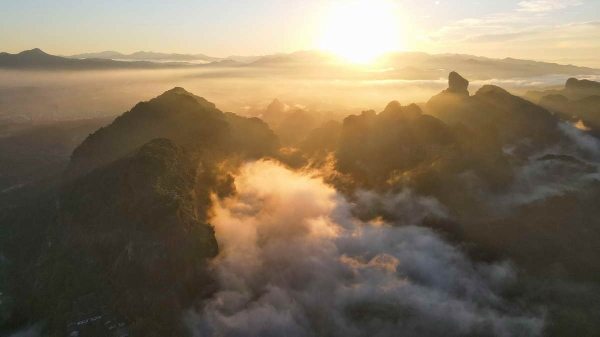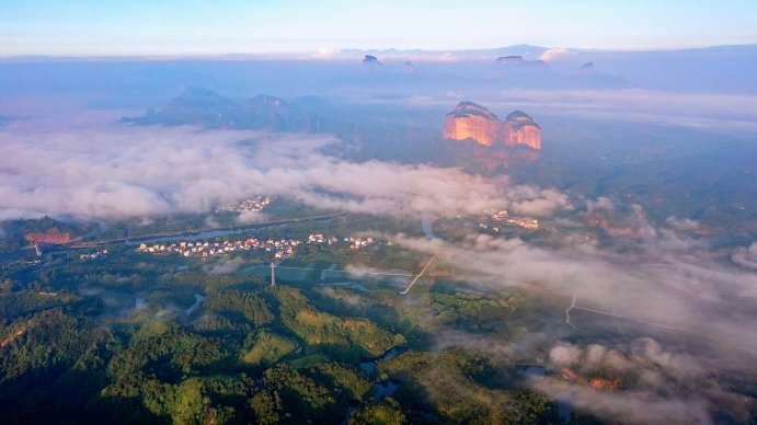 此外,正值秋收季节,丹霞山世界遗产地范围内的居民也迎来了丰收时刻,成片的金色稻谷随风摇曳,点缀着古村与丹霞赤壁,尤其是早晨或傍晚时分,锦江云雾缭绕腾空起,一幅田野风光画活灵活现。
