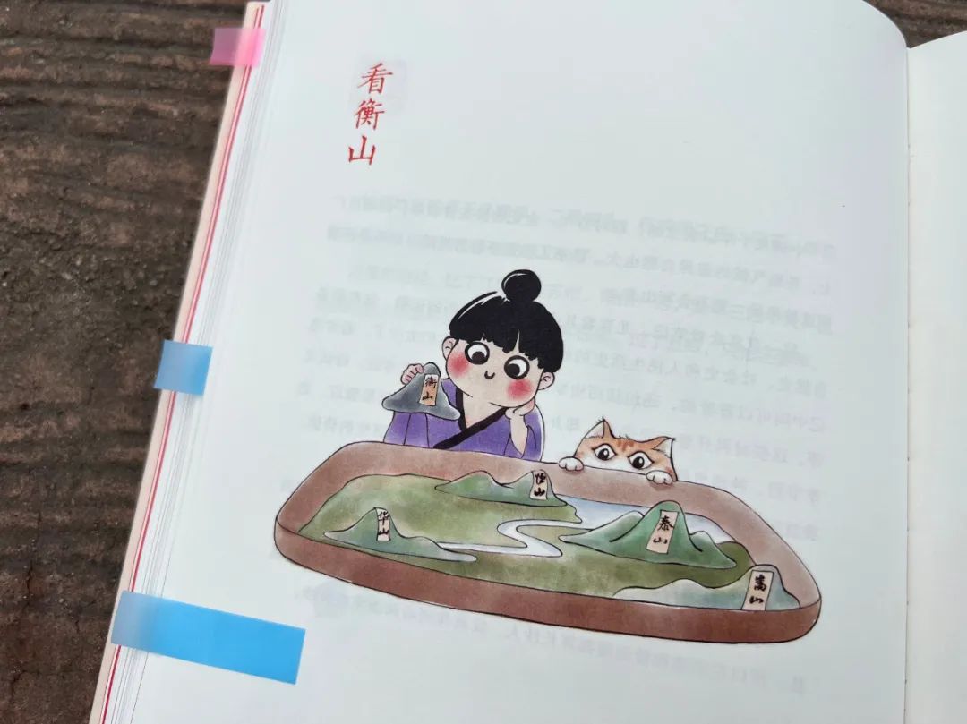 而书中的插图,模糊了真实与虚幻的界限,跳脱出写实的圈子,变换了常规的大小比例,萌趣十足,非常符合孩子的丰富想象力。比如《看衡山》中,插图是一个大沙盘,沙盘中摆放着五岳,而一个小孩子手里则拿起了衡山的模型,一只小猫咪在一旁看得津津有味。这种宏阔的视角,更能突出文中对衡山美景的描写。也符合孩子的好奇心理。