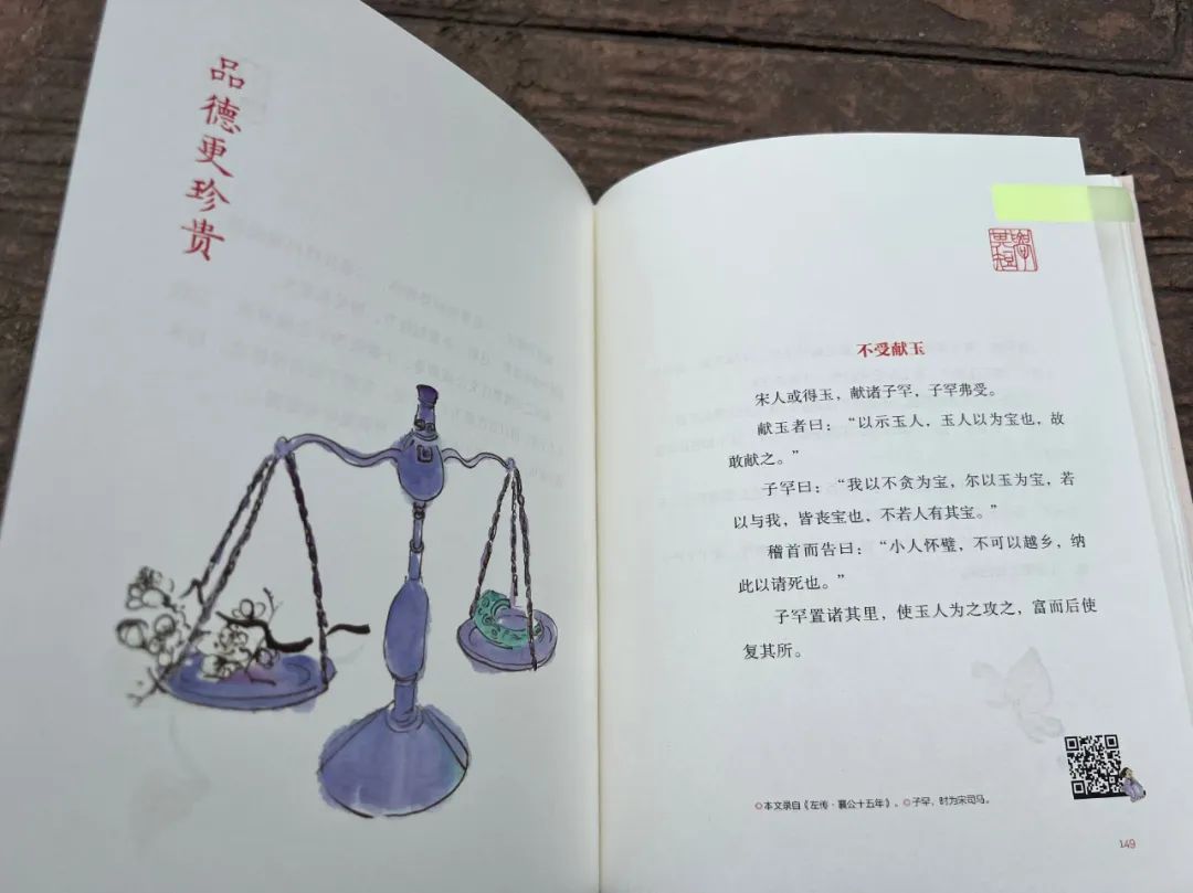 《给孩子读经典》从《论语》《孟子》《礼记》《左传》《国语》《战国策》《庄子》里共精选了66篇小古文,有师生之间聊人生志愿的,如孔子和颜渊、子路的小故事;也有讲品德的,如子罕不受玉的小故事;还有我们从小就都熟悉的孟姜女哭长城的民间小故事,等等。