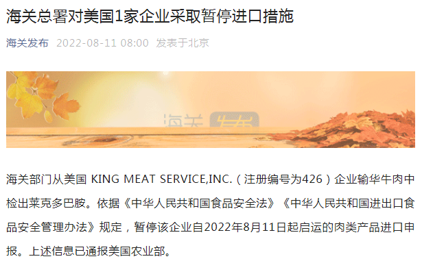 海关部门从美国 KING MEAT SERVICE,INC.(注册编号为426)企业输华牛肉中检出莱克多巴胺。依据《中华人民共和国食品安全法》《中华人民共和国进出口食品安全管理办法》规定,暂停该企业自2022年8月11日起启运的肉类产品进口申报。上述信息已通报美国农业部。