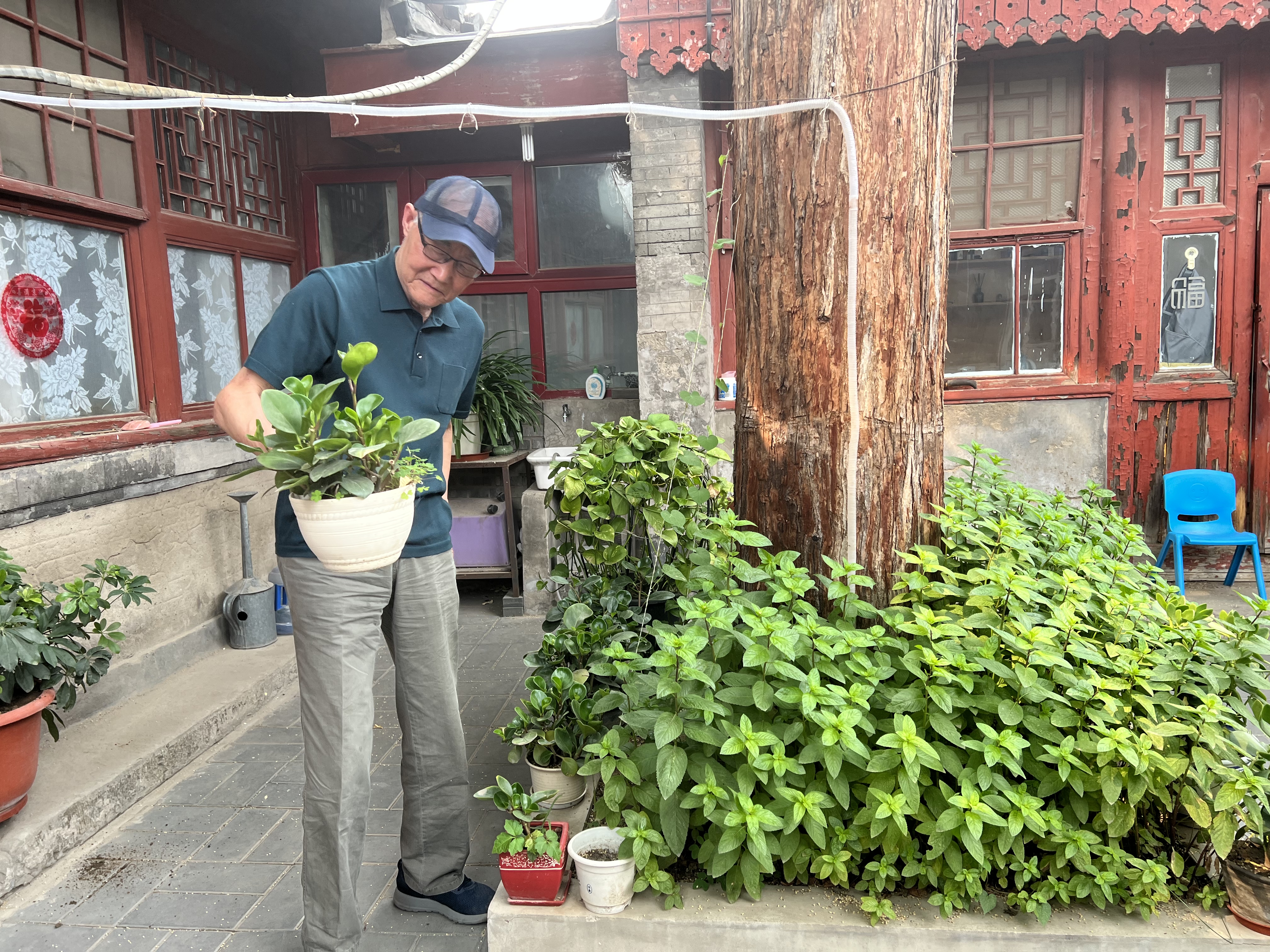 40号院的香椿树高大苍劲,朱茂锦老人在院里摆弄花草,生活惬意舒心。