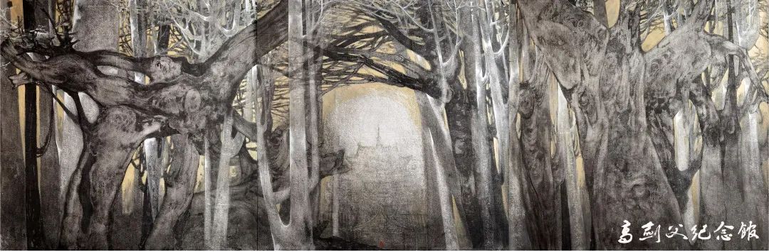 像这次展出的6米长、2.4米高的《归》,就是基于自己在广东不同山野体验生活、写生速写的强烈印象而创作完成,画的就是古树们相互依偎,生长向上的情境,树林深处隐约出现的光亮和庙宇,则象征着希望和宁静。