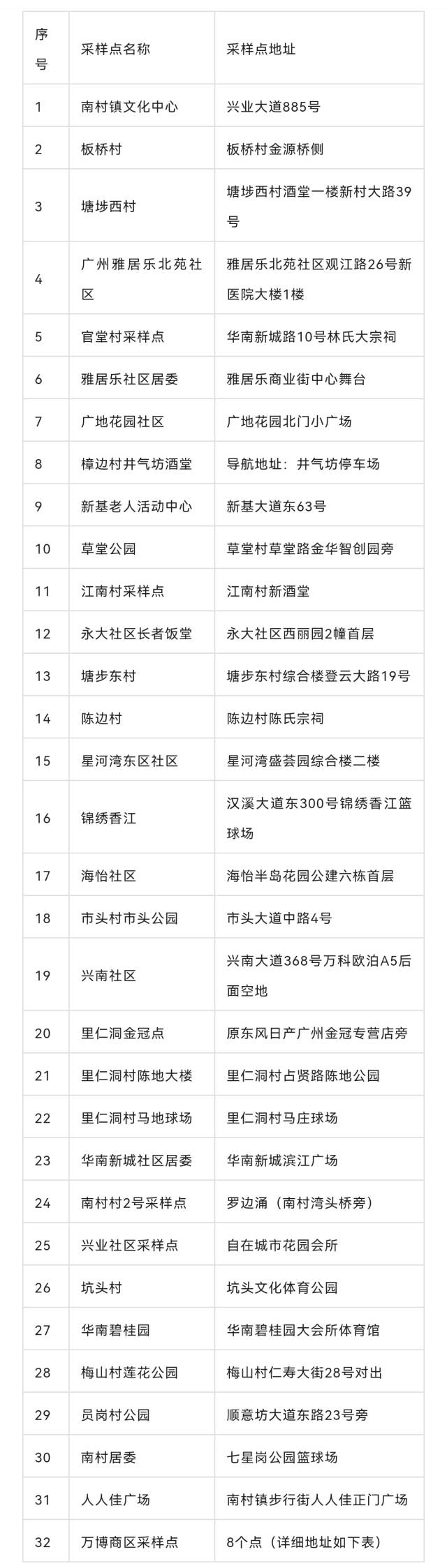 另据广州番禺区南村镇防控办信息,因疫情防控需要,根据统一安排,番禺区南村镇定于今日(8月14日)对全镇户籍人口、来番人员开展大规模核酸检测工作,全镇设39个核酸检测点。