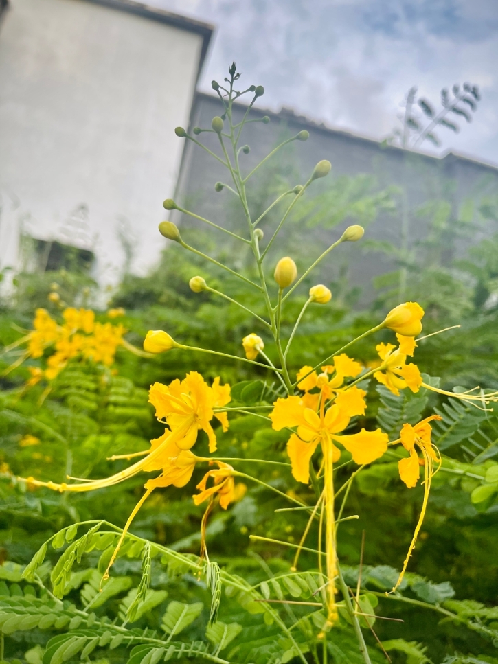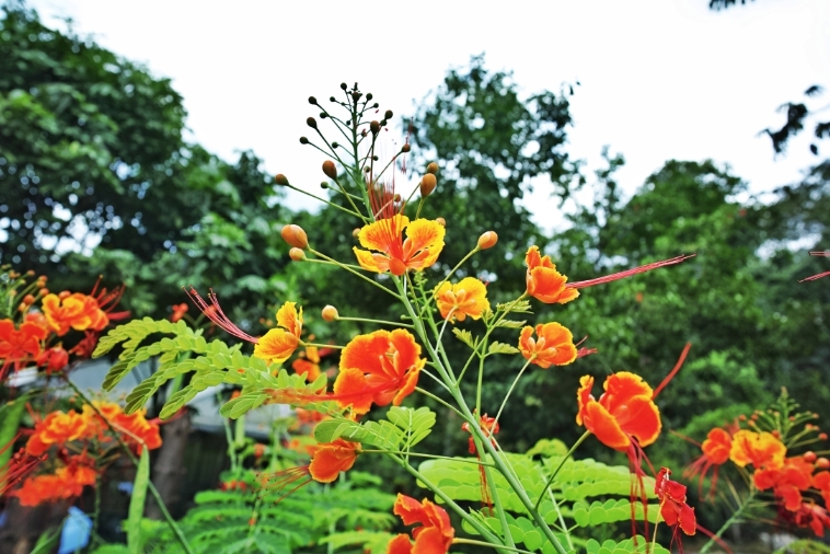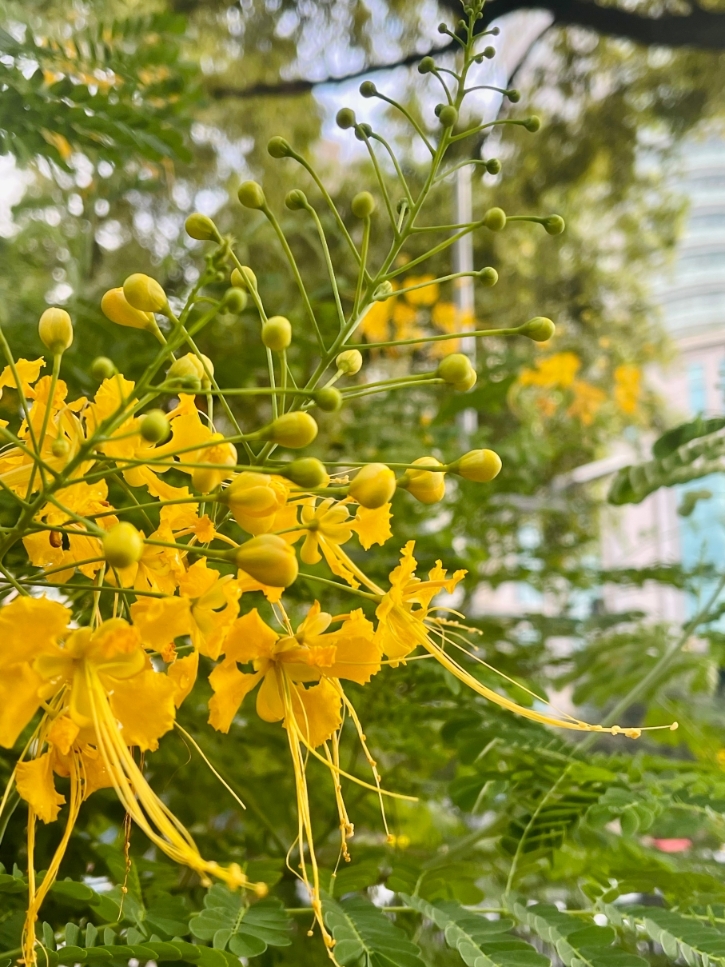 区分凤凰木和洋金凤的技巧,除了“身高”还有“颜值”。两者的花朵就像孪生姐妹,洋金凤简直就是灌木版的凤凰花,然而仔细观察会发现,洋金凤的花形虽然没有凤凰花大,但花蕊非常细长,总10枚长短不一的雄蕊和1枚雌蕊,以傲然之姿远远伸出花冠外。黄色或橙红色的花瓣边缘呈波状皱褶,开花时花瓣犹如色彩艳丽的小蒲扇;未开花时,花蕾看上去则像一个个长形的小汤勺,“盛放”着未开放的花瓣和花蕊。