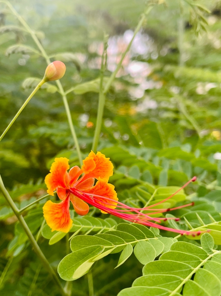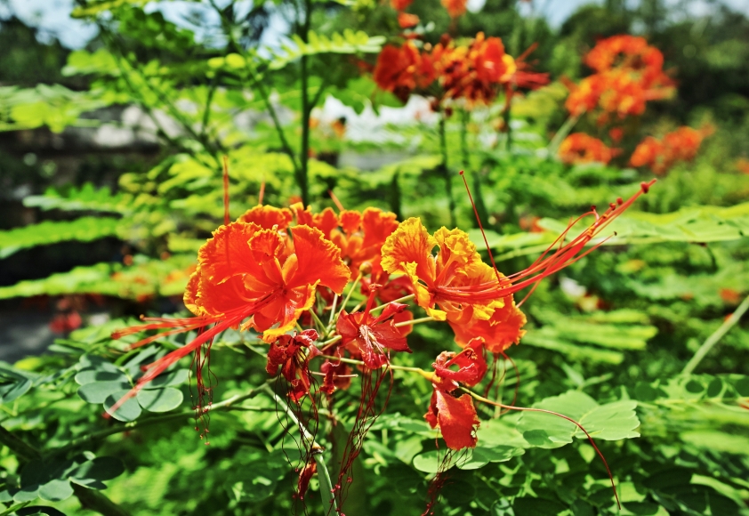 可以说,最终归属于“小凤花属”的洋金凤以花取胜,尤其当花朵盛开时花瓣五裂的姿态,鲜橙红色的花瓣犹如蝶翼一般,长长的花丝就像蝴蝶的触角,洋金凤又被称为“红蝴蝶”。这并不是它唯一的“昵称”,除了蝴蝶花、黄蝴蝶、番蝴蝶之外,还有孔雀花、蛱蝶花、红天堂鸟、墨西哥天堂鸟……其中最特别的名字非“巴巴多斯的骄傲”莫属。