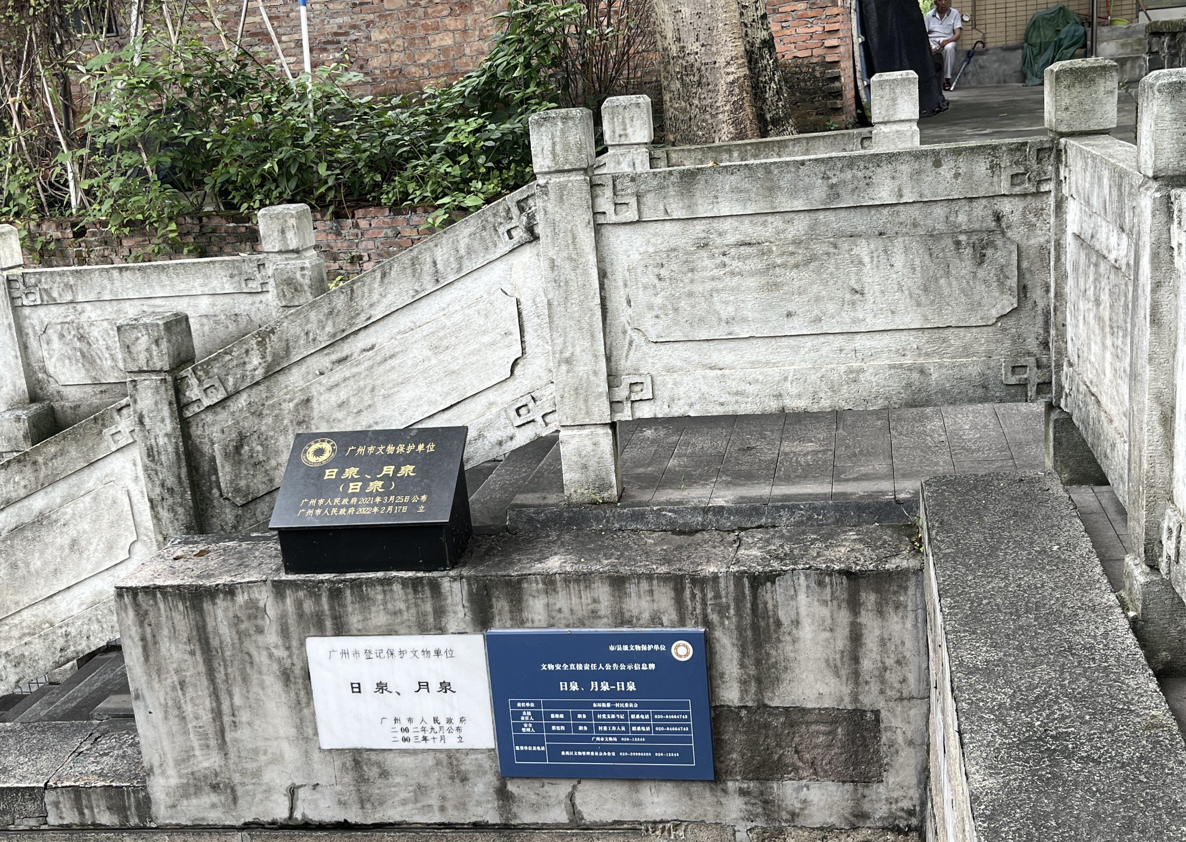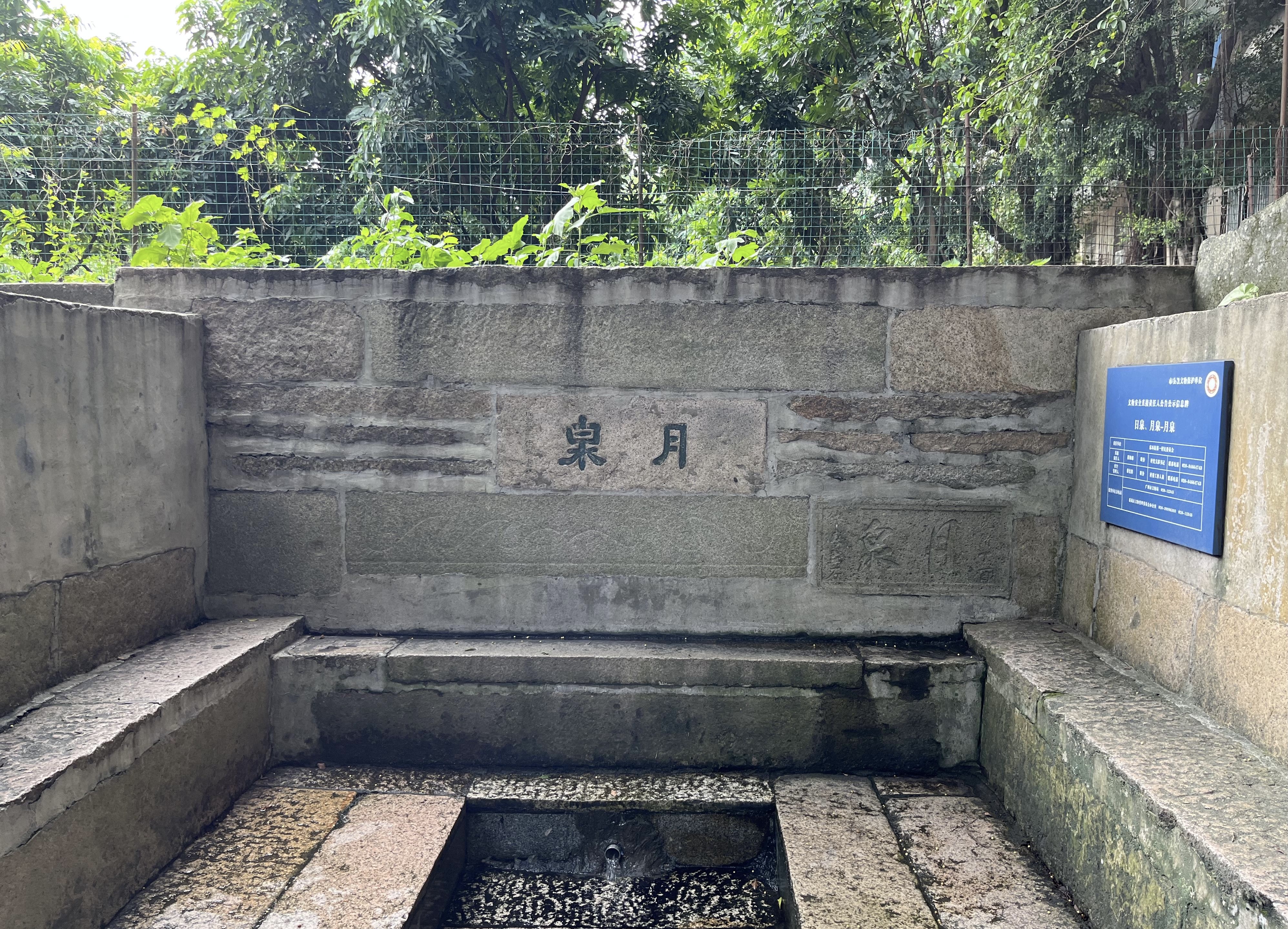 据悉,日泉、月泉建于清光绪丁酉年(1897),1998年重修。日泉坐南向北,占地面积17.48平方米,泉眼上方用花岗岩条石砌成三面围栏和井口平面,围栏平面呈“日”字形。月泉坐东南向西北,占地面积15.4平方米,泉眼上方用花岗岩条石砌成,由井口周围砌成长方形平面,四周三面砌成围栏,平面呈“月”字形。2002年9月,日泉、月泉被公布为广州市登记保护文物单位。2021年3月,日泉、月泉被广州市人民政府公布为第九批广州市文物保护单位。